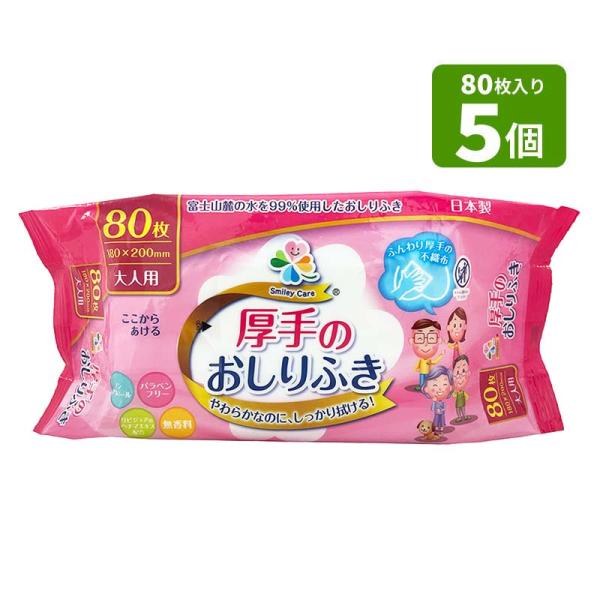 おしりふき 大人用 80枚 (18cm×20cm) 厚手のおしりふき 5個セット 日本製 水分99% ウエットタイプ 肌にやさしいノンアルコール 無香料 流せないタイプ