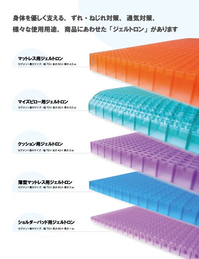 ・身体を優しく支える、ずれ・ねじれ対策、通気対策、様々な使用用途、商品に合わせたジェルトロンになっています。