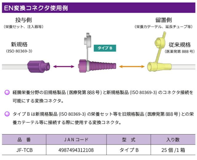・タイプBは新規格製品(ISO 80369-3)の栄養セット等を旧規格製品(医療発第888号)との栄養カテーテル等に接続する際に使用する変換コネクタ。