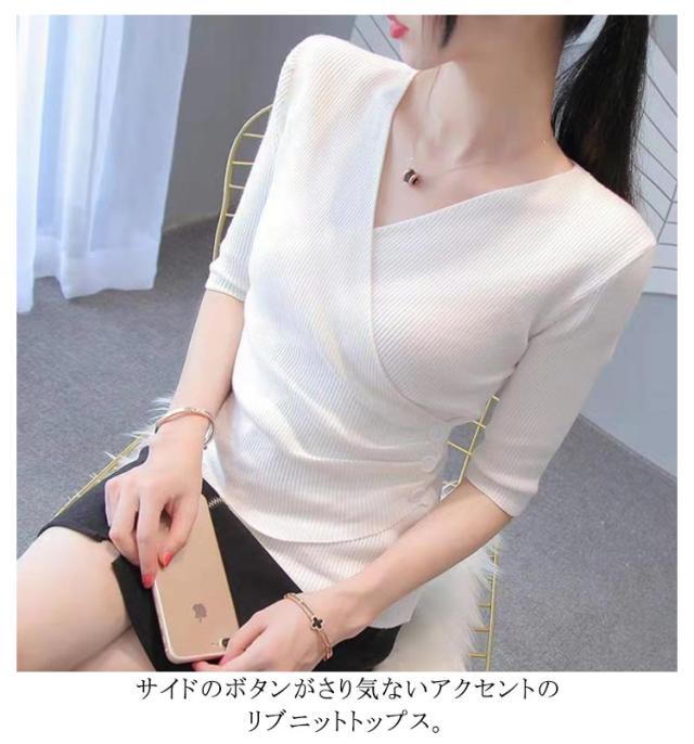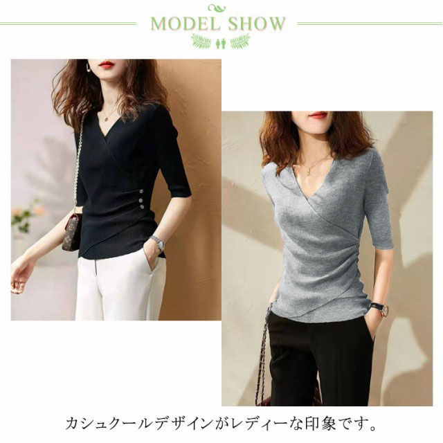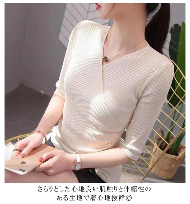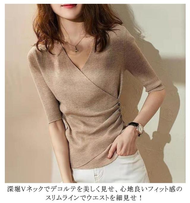 サマーニット レディース トップス 半袖 Vネック リブ Tシャツ 五分袖 スリム タイト カシュクール カットソー おしゃれ 着痩せ 無地 春夏 秋 Vネックニット 送料無料