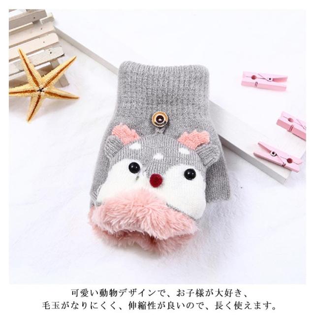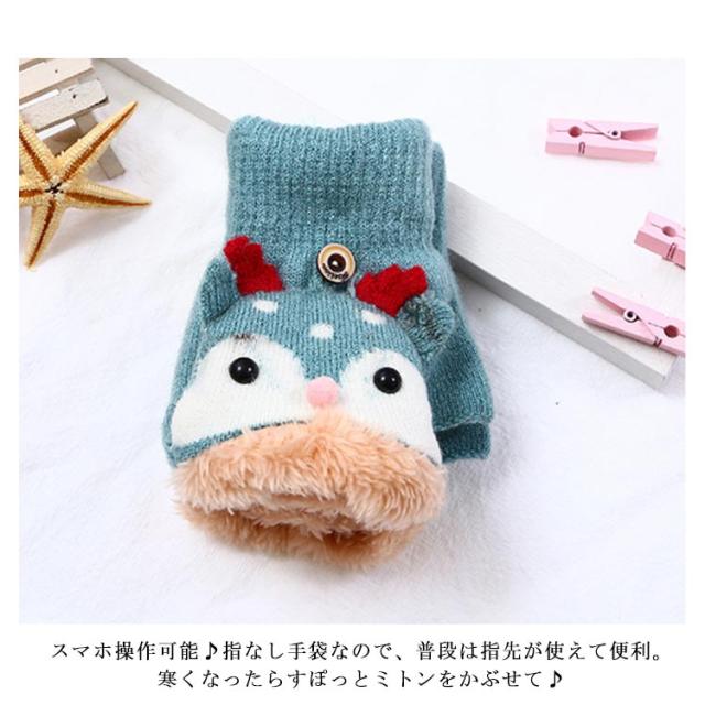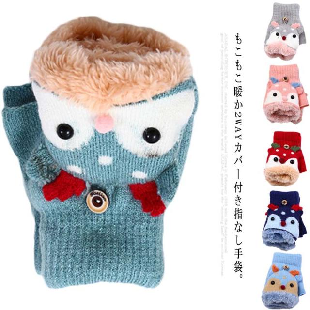 | もこもこ暖か2WAYカバー付き指なし手袋。 スマホ操作可能♪指なし手袋なので、普段は指先が使えて便利。寒くなったらすぽっとミトンをかぶせて♪ 内側ボア素材でふわふわ柔らかな肌触り、防風・防寒効果◎優しくフィットします。 可愛い動物デザインで、お子様が大好き、毛玉がなりにくく、伸縮性が良いので、長く使えます。 | |