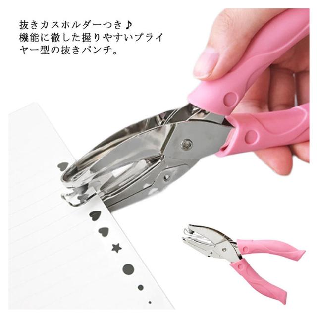 | 抜きカスホルダーつき♪機能に徹した握りやすいプライヤー型の抜きパンチ。 小丸形、大丸形、星形、ハート形など全5タイプ展開で、カード、タグ、写真、手紙、スクラップブックなどのデコレーションにぴったりです。 ハンドルは柔らかく滑り止め効果のあるゴムカバー付き、握るだけで簡単に穴を開けることができます。 一度一般的なコピー用紙6〜8枚程度穴開けできます。 嬉しい抜きカスホルダー付きで、穴を開けたときに出る小さな不要紙も、まとめて捨てることができるからとても便利。 | |