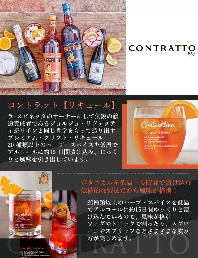 イタリアの名門ワイナリーがつくるプレミアム・リキュール『コントラット・ビター』「プレミアム・クラフトリキュール」人工的な着色料・甘味料不使用!ラ・スピネッタのオーナーにして気鋭の醸造責任者であるジョルジョ・リヴェッティがワインと同じ哲学をもって造り出すプレミアム・クラフト・リキュール! 鮮やかな赤色は、ビーツを使った天然の色です!ボタニカルを低温・長時間で漬け込む伝統的な製法だから風味が格別! コントラット・アペリティフでつくるスプリッツ“コントラッティーノ”、コントラット・ビターとヴェルモットをあわせる“ネグローニ”、コントラット・ビターとサイダーにオレンジを添えた“マレフィセンス”! |