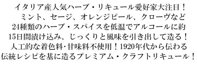 イタリア産人気ハーブ・リキュール愛好家大注目! ミント、セージ、オレンジピール、クローヴなど 24種類のハーブ・スパイスを低温でアルコールに約 15日間漬け込み、じっくりと風味を引き出して造る! 人工的な着色料・甘味料不使用!1920年代から伝わる 伝統レシピを基に造るプレミアム・クラフトリキュール!