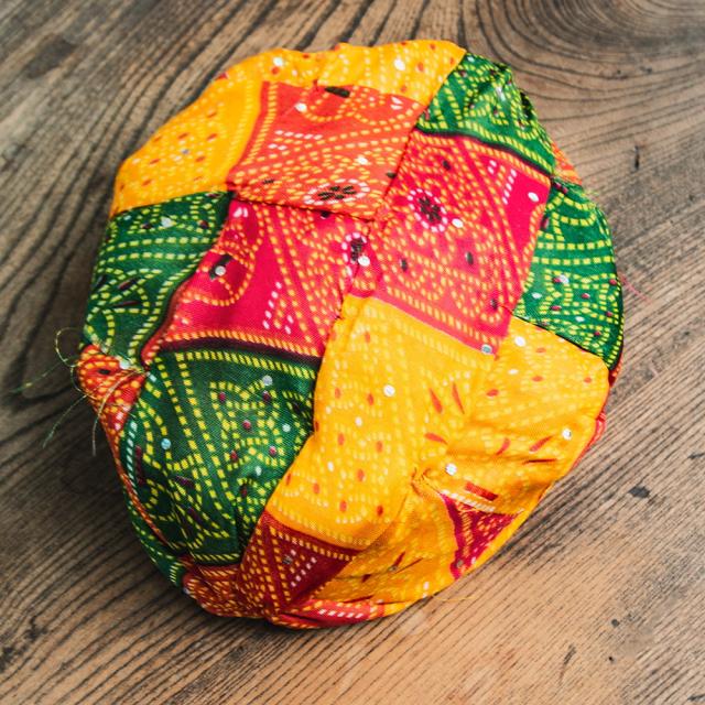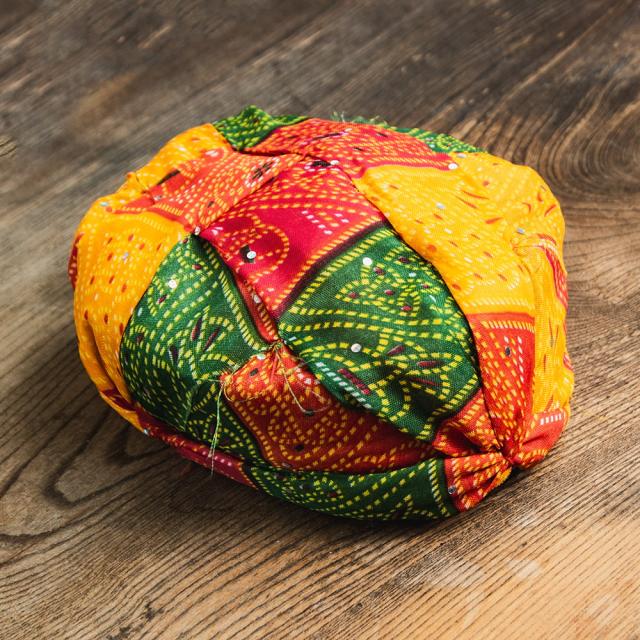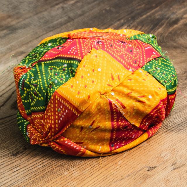 ボール紙や新聞紙を折りたたんでターバンの型を作り、その上から布とスポンジを被せたという大変簡単な作りになっています。これもインドの手作りならではの味わいかと思います。