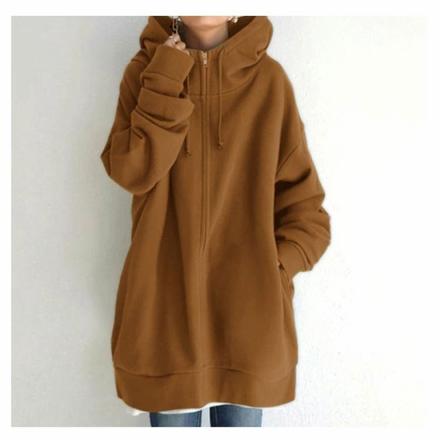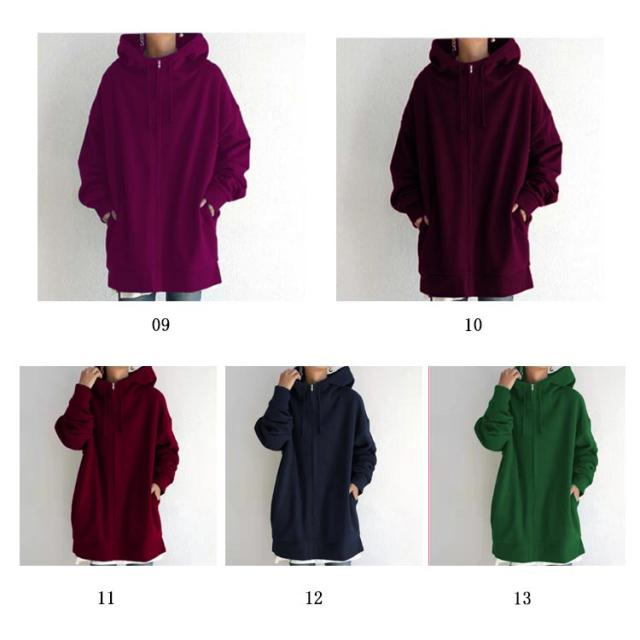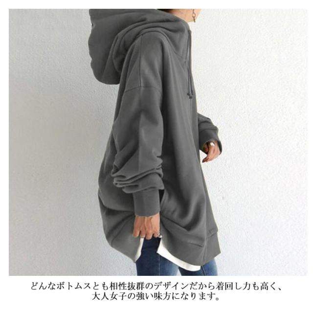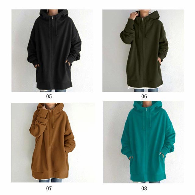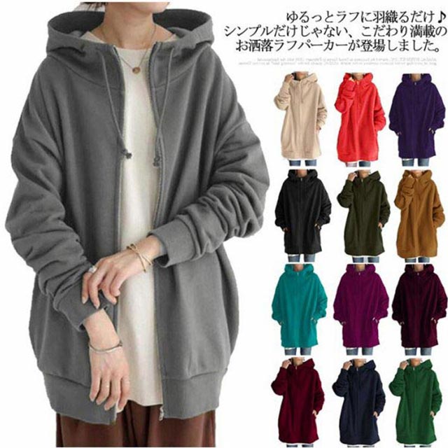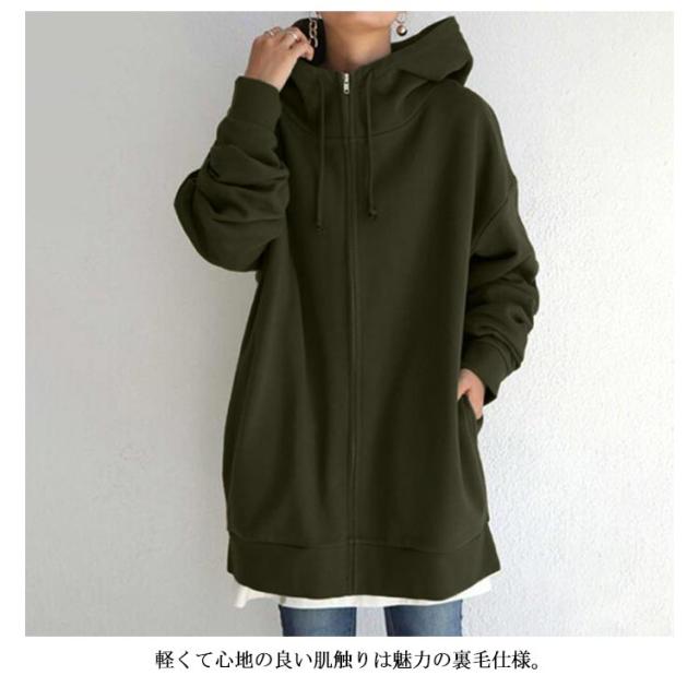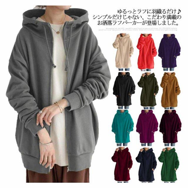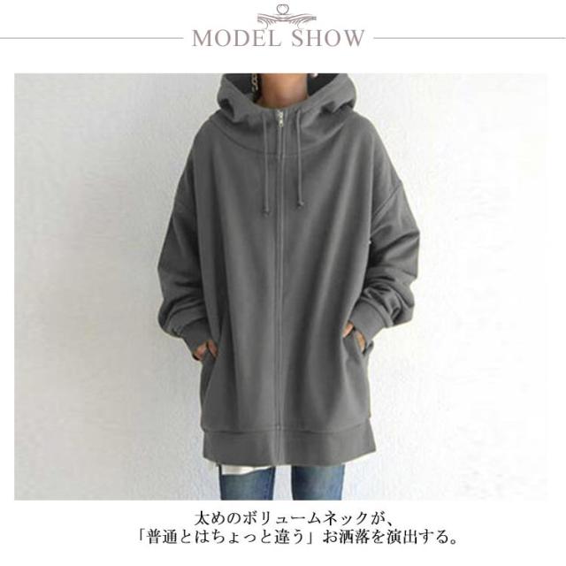 全13色 パーカー レディース 春 おしゃれ 無地 シンプル 裏起毛 ロング丈 大きめ ボリュームネック ハイネック フード付き ジップアップパーカー 韓国 ストリート ロングパーカー