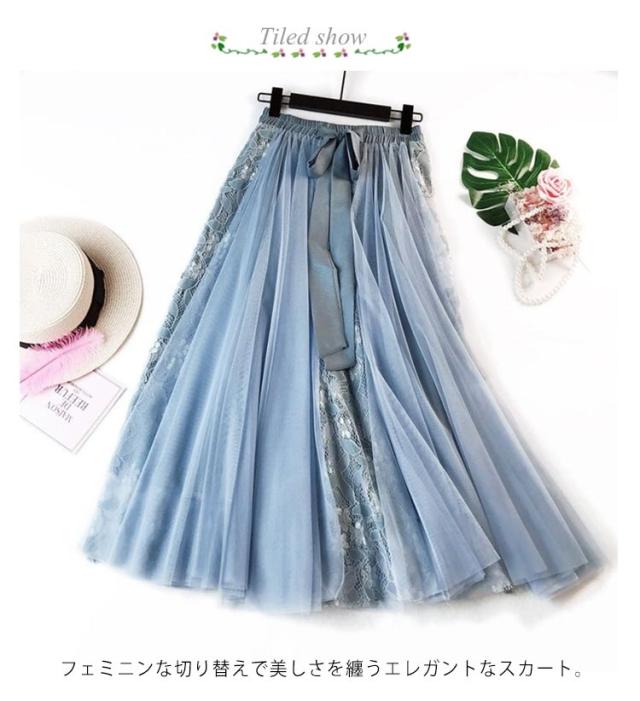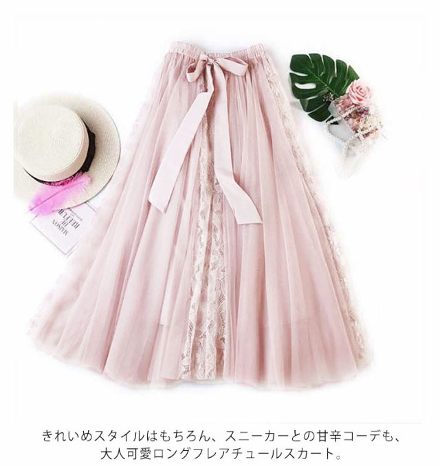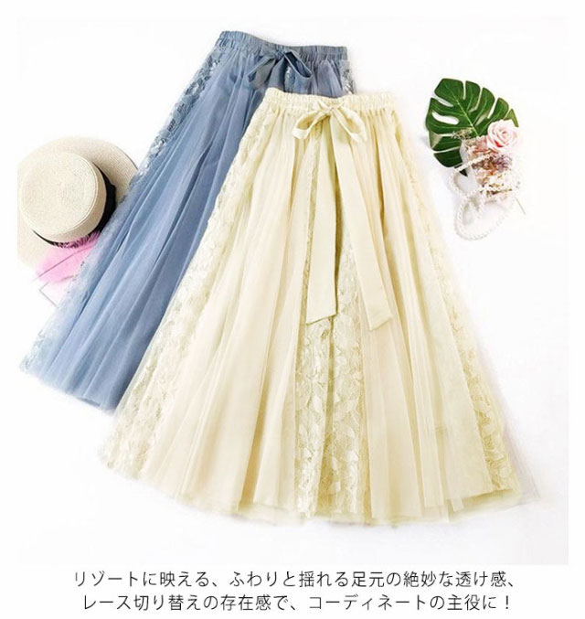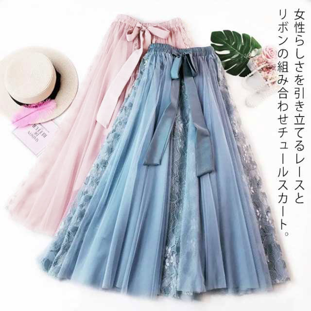 レース切り替え スカート ロング レース チュールスカート ロングスカート フレアスカート リボン ミモレ丈 スカート 裏地付き ボリューム トレンド ゆったり かわいい 動きやすい 春夏 S M L XL 2XL 送料無料