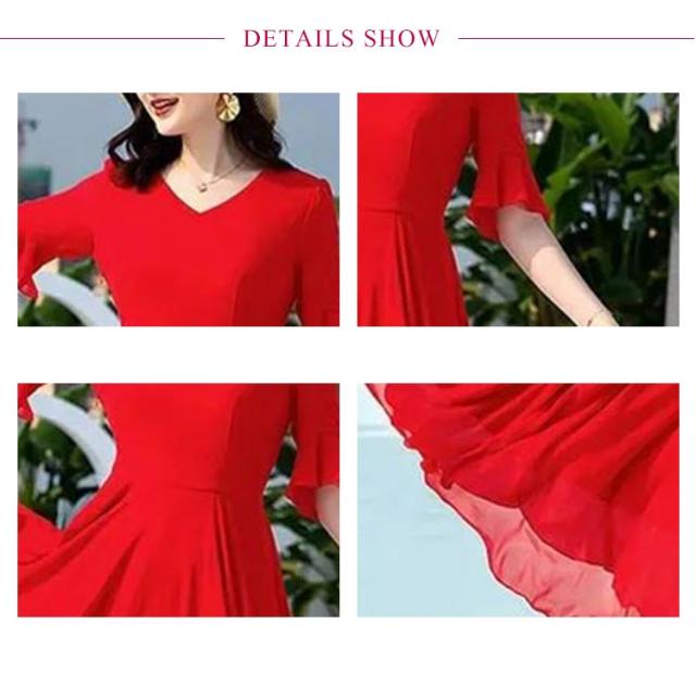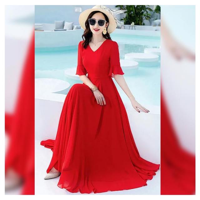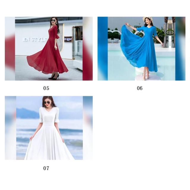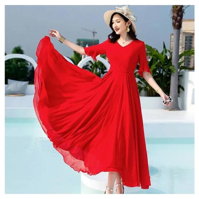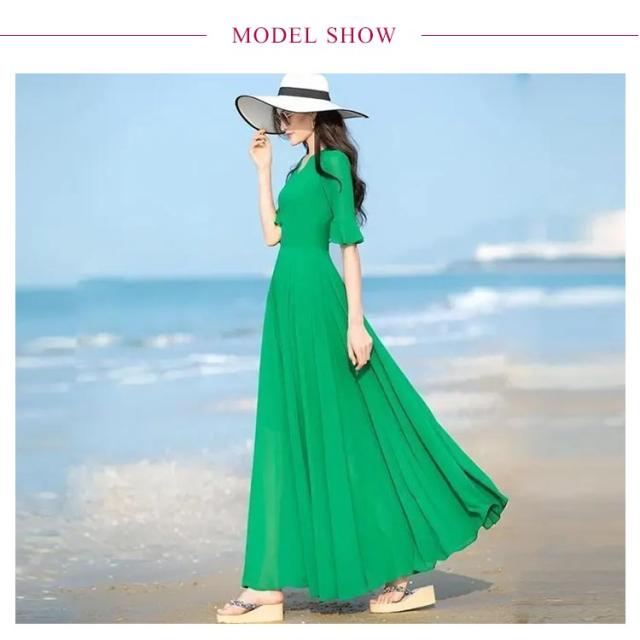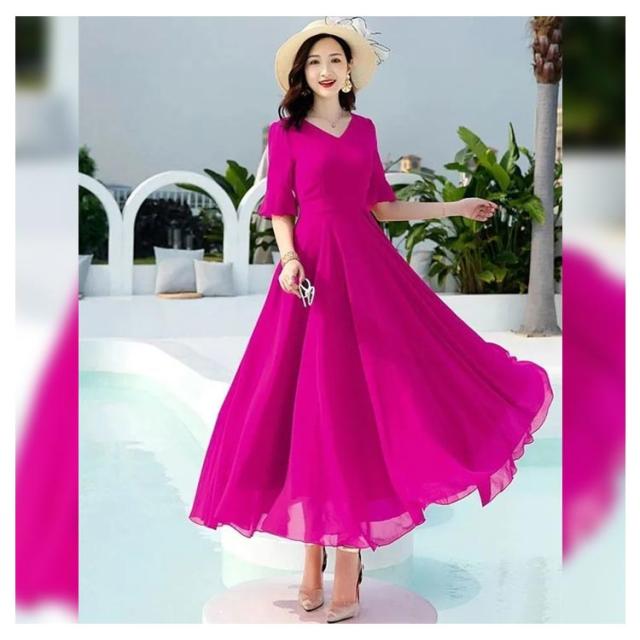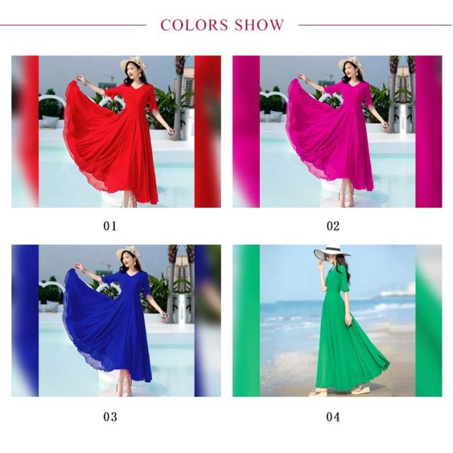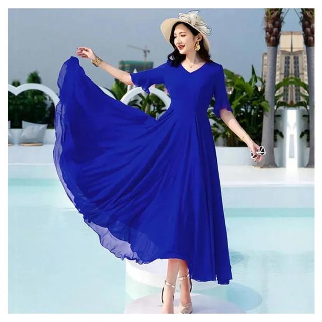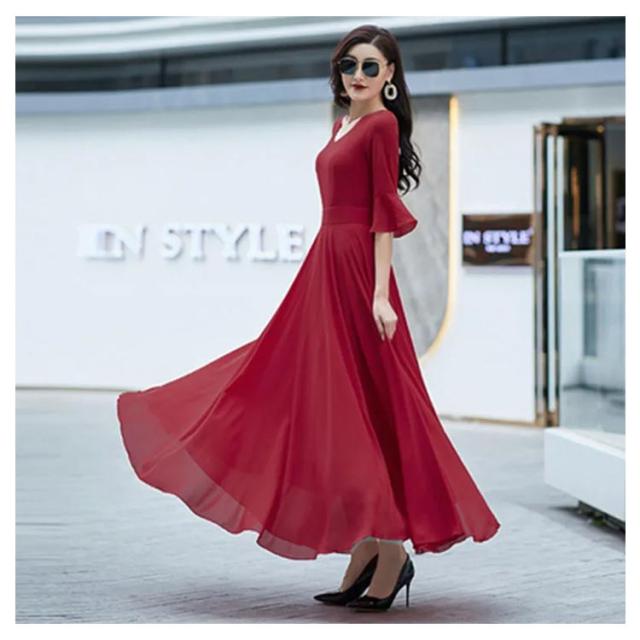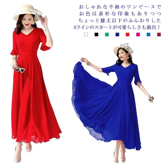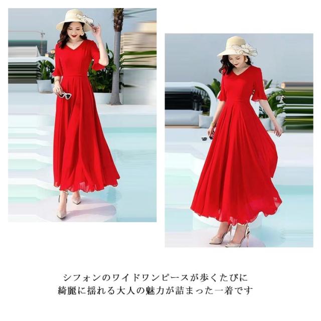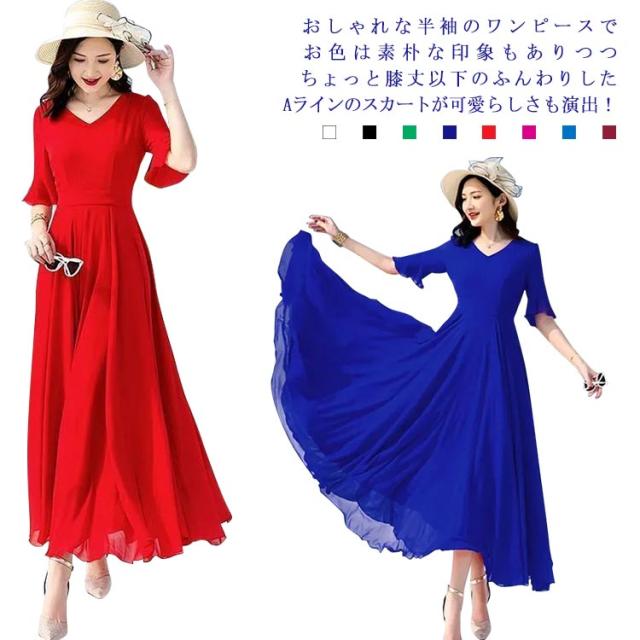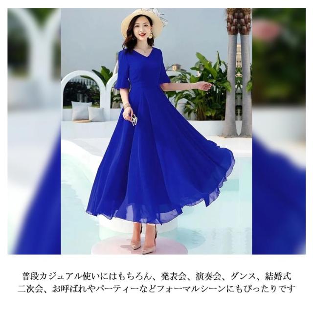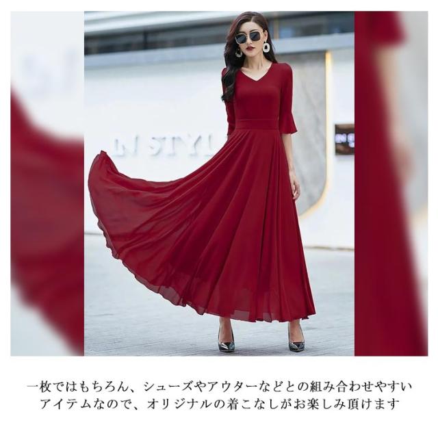 全7色 ワンピース レディース ロングワンピース シフォンワンピース aライン フレアワンピース ミモレ丈ワンピース 五分袖 Vネック 夏 フォーマル 通勤 二次会 発表会 演奏会 無地 優雅 お洒落 大きいサイズ