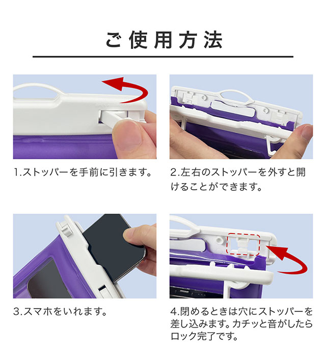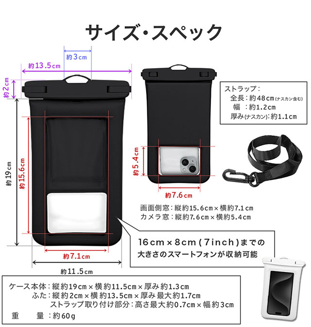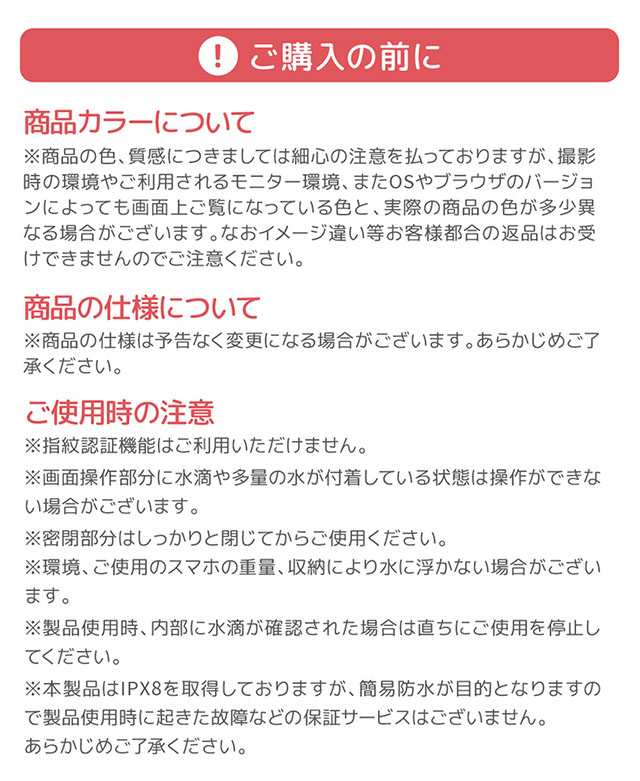・ご使用の機種によってはケースを着用していると防水ケースに入らない場合がございます。ご購入前にご使用するスマートフォンのサイズをお確かめください。