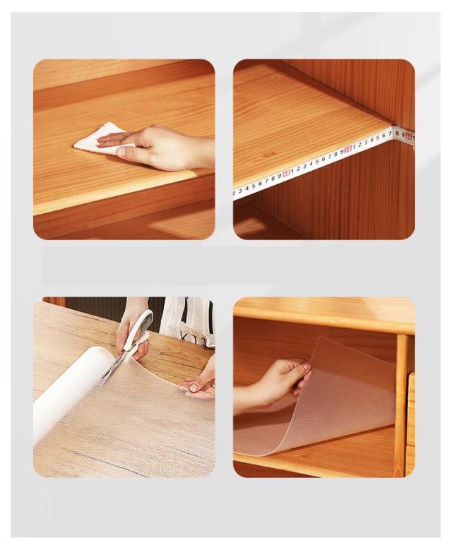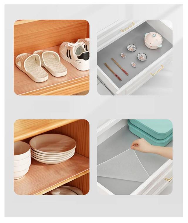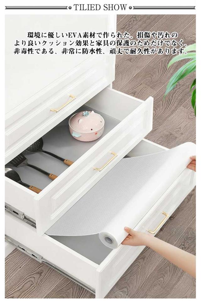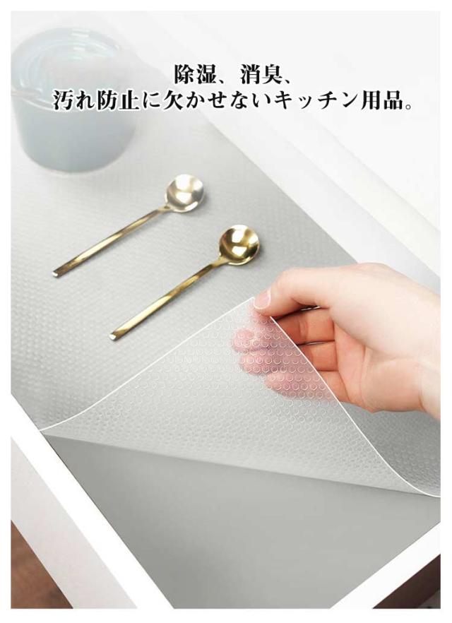 | 食器棚の棚板に敷くだけで、消臭・抗菌・防カビが期待できる食器棚シートです。 環境に優しいEVA素材で作られた、損傷や汚れのより良いクッション効果と家具の保護のためだけでなく、非毒性である、非常に防水性、頑丈で耐久性があります。 裏面にスベリ止め加工を施していますので、食器の出し入れの際などに、クロスがズレたりシワが寄るのを防ぎます。 手洗いできるので、お手入れもカンタン! 設置場所に合わせて好きなサイズにカットできるので、キッチンの食器棚や冷蔵庫はもちろん、押し入れ、下駄箱など、様々な場所で使えるシェルフライナーです。 除湿、消臭、汚れ防止に欠かせないキッチン用品。 | |