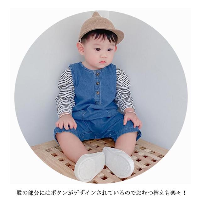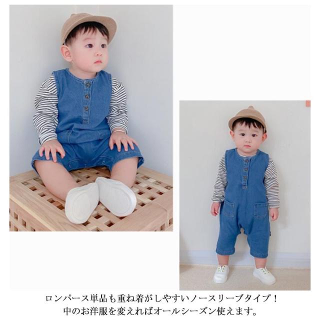 | カジュアルな装いのシンプルなデニムロンパースとボーダーTの2点セット♪ ロンパース単品も重ね着がしやすいノースリーブタイプ!中のお洋服を変えればオールシーズン使えます。 男女関係なく使える一枚だから女の子も男の子も可愛くおしゃれに♪ 腕周りが大きめにデザインされているので重ね着がしやすい。 股の部分にはボタンがデザインされているのでおむつ替えも楽々! 通気性がよく綿100%でお肌にも安心安全。 | |