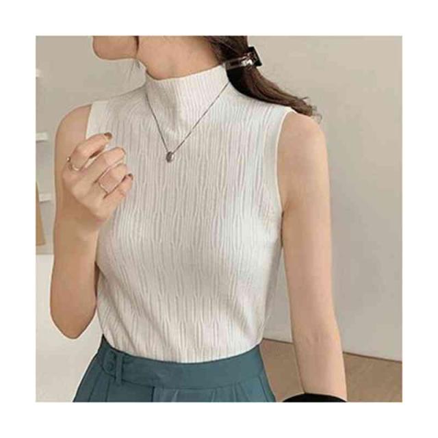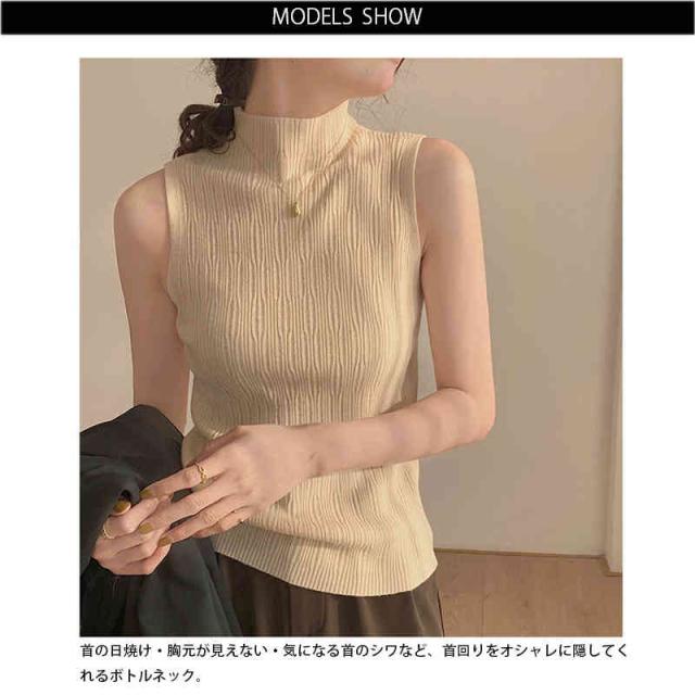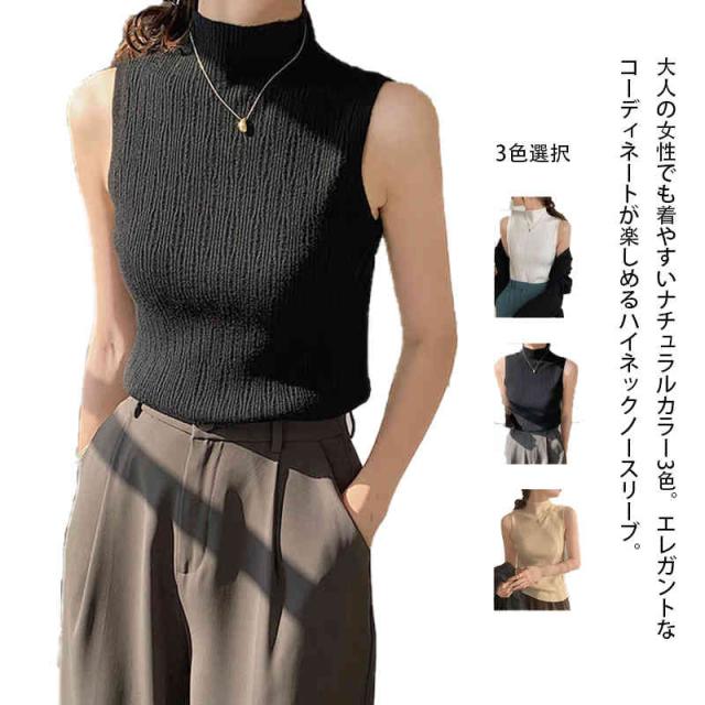 サマーニット ハイネック ノースリーブ ニットトップス カットソー Tシャツ タートルネック 薄手 ボトルネック トップス UVカット ストレッチ 春夏 秋冬インナー 送料無料