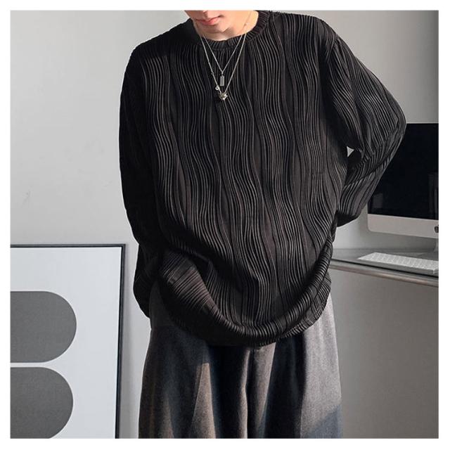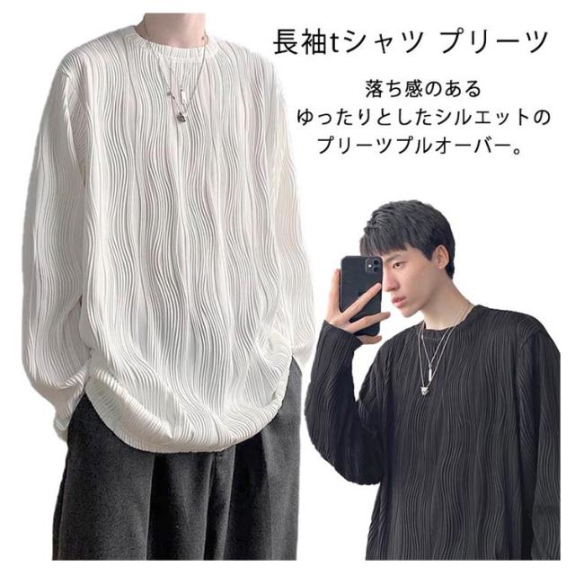 M−3XLサイズ!メンズtシャツ ロングtシャツ プリーツ加工 カットソー 丸首 薄手 メンズ 長袖 ロンT 無地 レディース Uネック 落ち感 クルーネック オーバーサイズ 韓国風 春 夏 秋 冬 ストリート ブラック ホワイト 白 黒 送料無料