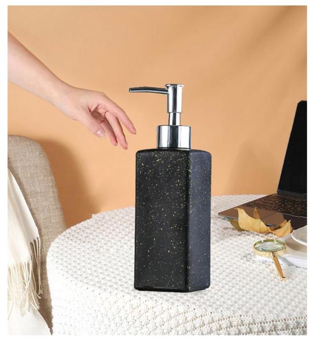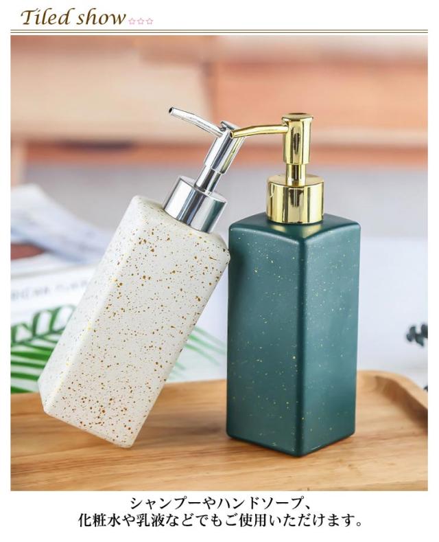 | デザイン性にも機能性にも優れた詰め替え用ポンプボトルです。 シャンプーやハンドソープ、化粧水や乳液などでもご使用いただけます。 詰め替える時は上蓋が外れ、注ぎやすいのもうれしいポイント。 方形で安定感があり、浴室などの隙間スペースに置いても無駄なく。 洗面化粧台の置物やバスルームのタイルなどのインテリア素材にマッチ。 | |