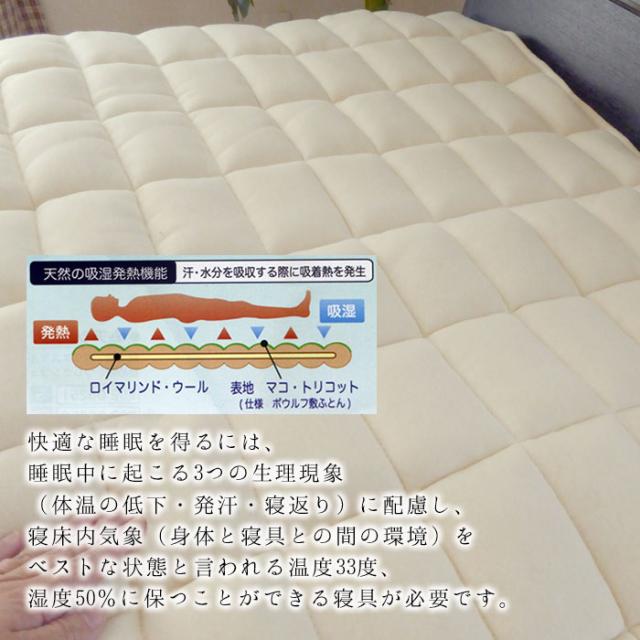 このベッドパッドは、羊毛の自然な特性を活かし、優れた吸湿性と発散性を提供します。
