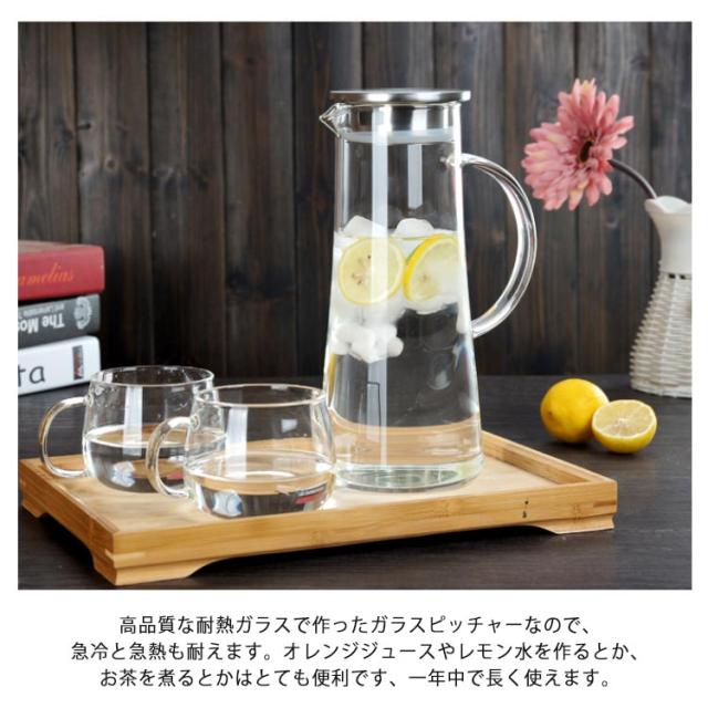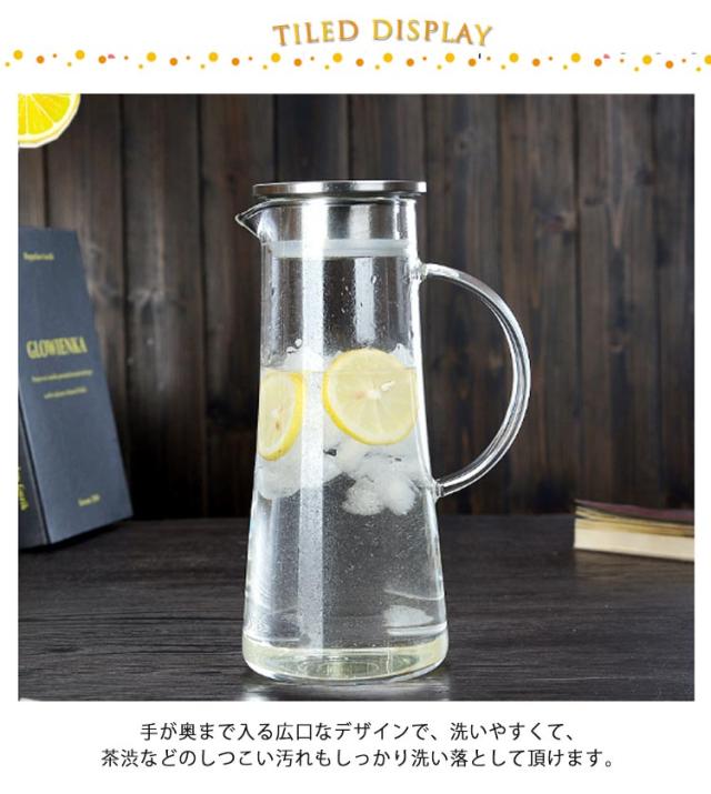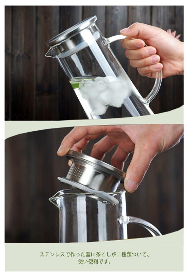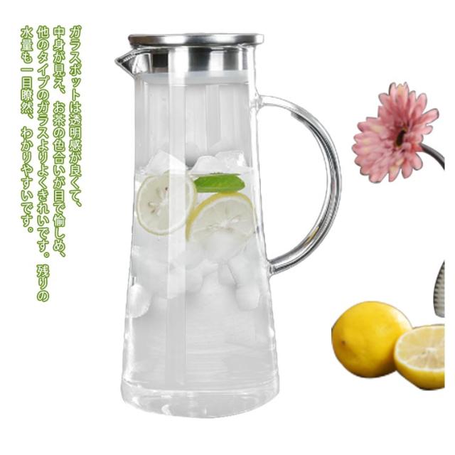 | ガラスポットは透明感が良くて、中身が見え、お茶の色合いが目で愉しめ、他のタイプのガラスよりよくきれいです。残りの水量も一目瞭然、わかりやすいです。 手が奥まで入る広口なデザインで、洗いやすくて、茶渋などのしつこい汚れもしっかり洗い落として頂けます。 素材は耐熱ガラスを採用したから、直火対応でき、お茶などの煮るのはそれを使っていいです、とても便利です。 容量は1.5リットルで、一人なら一日の量は充分満足できます。 ステンレスで作った蓋に茶こしが二種類ついて、使い便利です。 食器洗浄機対応できます。 高品質な耐熱ガラスで作ったガラスピッチャーなので、急冷と急熱も耐えます。オレンジジュースやレモン水を作るとか、お茶を煮るとかはとても便利です、一年中で長く使えます。 | |