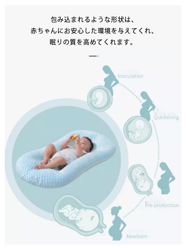 | 添い寝用のベッドインベッドとして使用可能。 赤ちゃんをふんわりと包み込んで、親の寝返り被害からしっかり守り、夜間授乳やおむつ替えも便利です。 包み込まれるような形状は、赤ちゃんにお安心した環境を与えてくれ、眠りの質を高めてくれます。 ファスナー付き、カバーを外して水洗いも可能です。 ベッドの上、ソファの上、畳の上、さまざまなシーンでお使いいただけます。 軽量で帰省や旅行にも携帯便利です。 | |