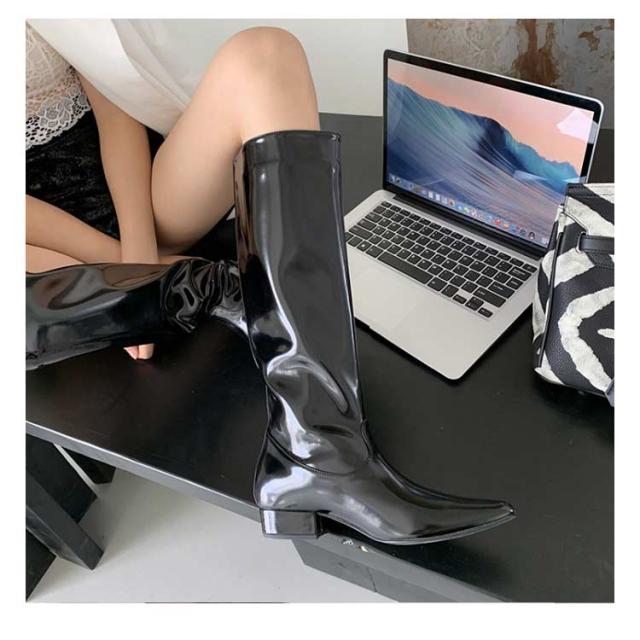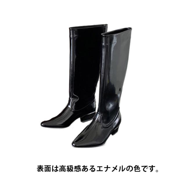 | 膝(ひざ)丈のロングブーツです。 スクエア型ヒールのため、履きやすいブーツです。 表面は高級感あるエナメルの色です。 | |
