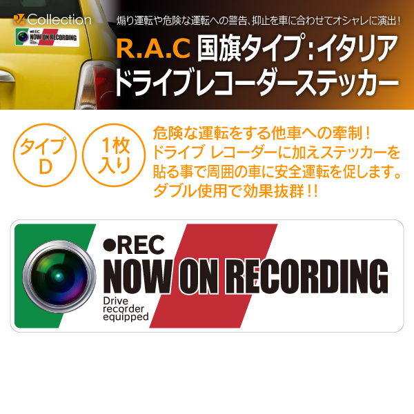 【在庫限】R.A.C ドライブレコーダー ステッカー 国旗タイプ(イタリア: D) サイズ:幅14.0cmx高4.0cm 内容:1枚入(商品コード:501073)