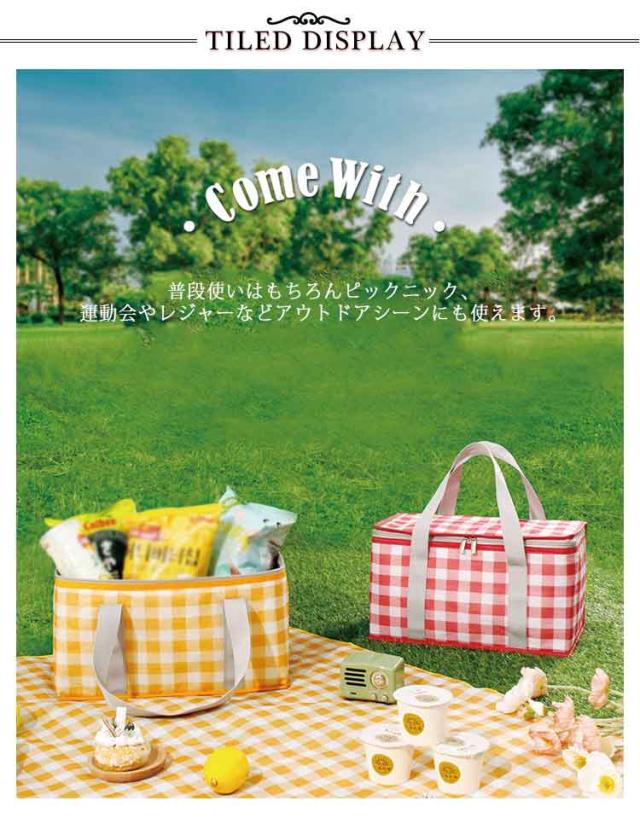 | 様々なシーンでマルチに使える保冷保温バッグ 普段使いはもちろんピックニック、運動会やレジャーなどアウトドアシーンにも使えます。 内側はアルミ蒸着フィルムで保冷保温!夏だけでなく冬は暖かい食べ物を運ぶのにもオススメ。 便利なダブルファスナー、物の出し入れがスムーズに。 コンパクトに折りたたみ可能、持ち運びにも便利で収納場所にも困りません♪ 自転車のカゴに入るので、サイクリングや自転車でのお買い物に行く際にもおすすめです。 | |