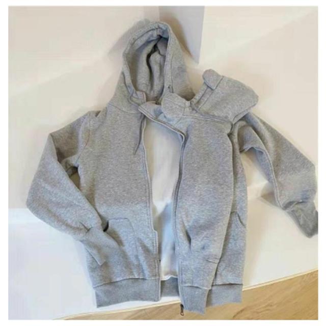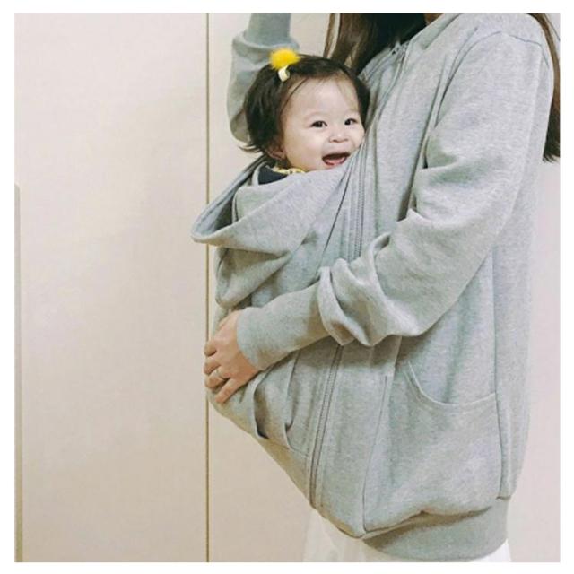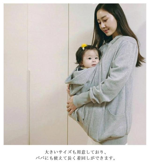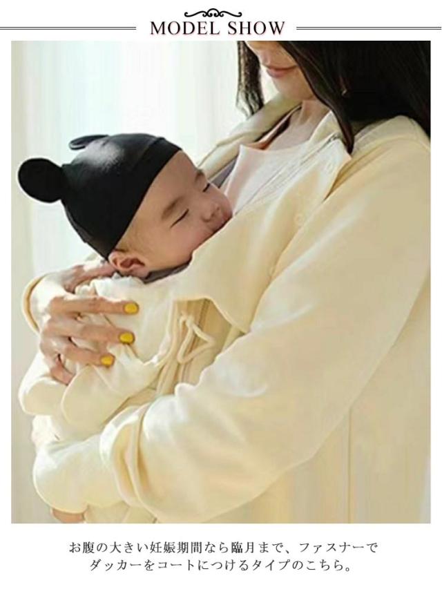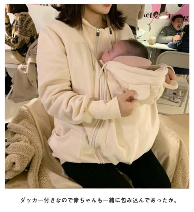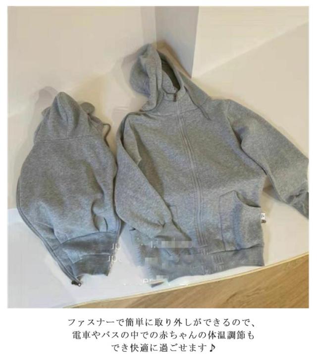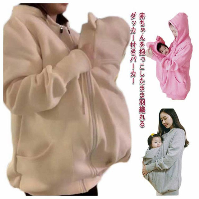 | 赤ちゃんを抱っこしたまま羽織れるダッカー付きパーカー お腹の大きい妊娠期間なら臨月まで、ファスナーでダッカーをコートにつけるタイプのこちら。 ダッカー付きなので赤ちゃんも一緒に包み込んであったか。 フードつきで頭から足先まで赤ちゃんを寒さから守ります! ファスナーで簡単に取り外しができるので、電車やバスの中での赤ちゃんの体温調節もでき快適に過ごせます♪ 裏起毛なのでママもお子様もあたたかく過ごせる優秀アウターです。 大きいサイズも用意しており、パパにも使えて長く着回しができます。 | |