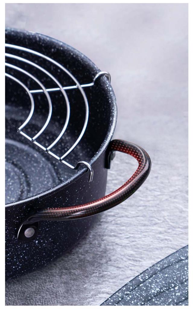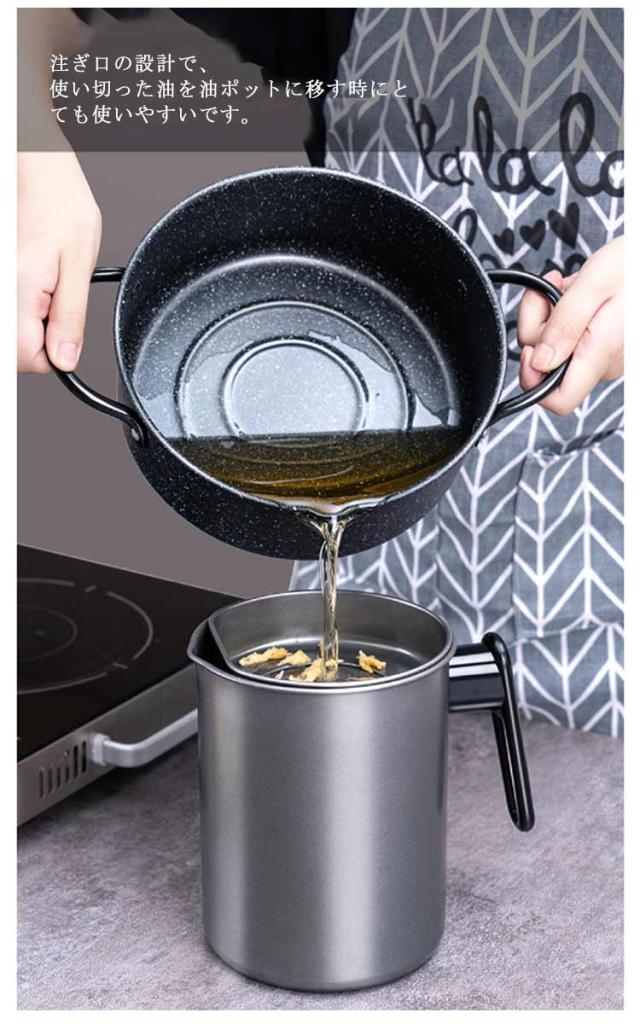 | 油切りラックがついておりますので、切った油はそのまま鍋に流せるので、とてもエコです。 揚げながらも油切りできますので、便利で使い心地が良いです。 ガスコンロにもIHクッキングヒーターにも対応します。 注ぎ口の設計で、使い切った油を油ポットに移す時にとても使いやすいです。 ご注意:オーブン、電子レンジに対応しません。 | |