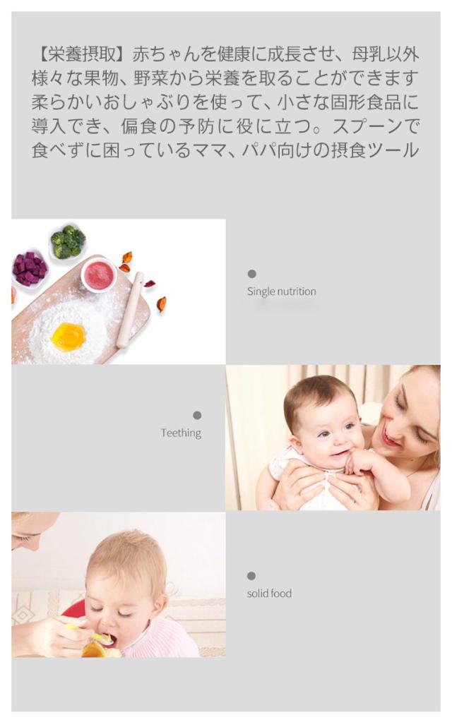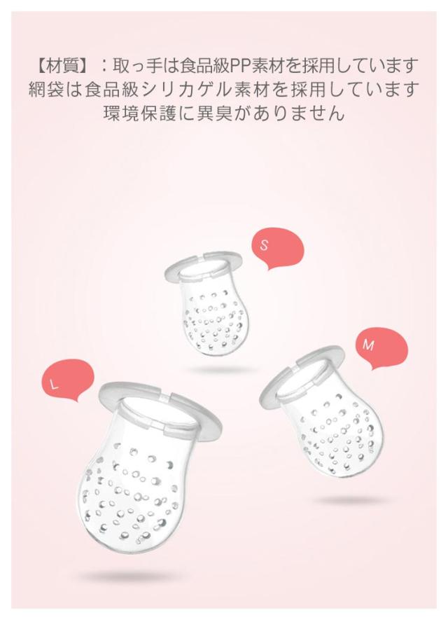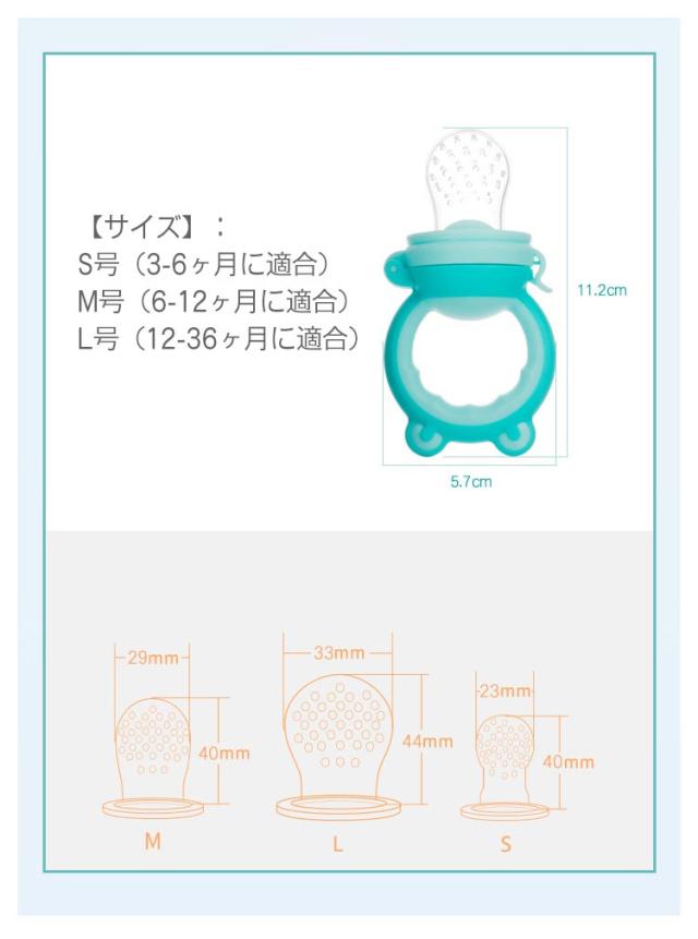 | 【材質】:取っ手は食品級PP素材を採用しています。網袋は食品級シリカゲル素材を採用しています。環境保護に異臭がありません。 【サイズ】:S号(3-6ヶ月に適合)、M号(6-12ヶ月に適合)、L号(12-36ヶ月に適合) 【安全性】食品級の丈夫なシリコン素材を採用しており、安全性が高く、老化しにくいです。赤ちゃんの手で外さないスナップショットロックは、内容が漏れないデザインなので、安心です。柔らかいシリコンのおしゃぶりは最初の歯のかゆみに最適です。 【栄養摂取】赤ちゃんを健康に成長させ、母乳以外、様々な果物、野菜から栄養を取ることができます。柔らかいおしゃぶりを使って、小さな固形食品に導入でき、偏食の予防に役に立つ。スプーンで食べずに困っているママ、パパ向けの摂食ツール。 | |