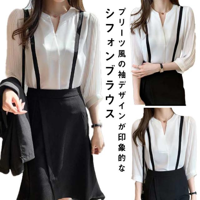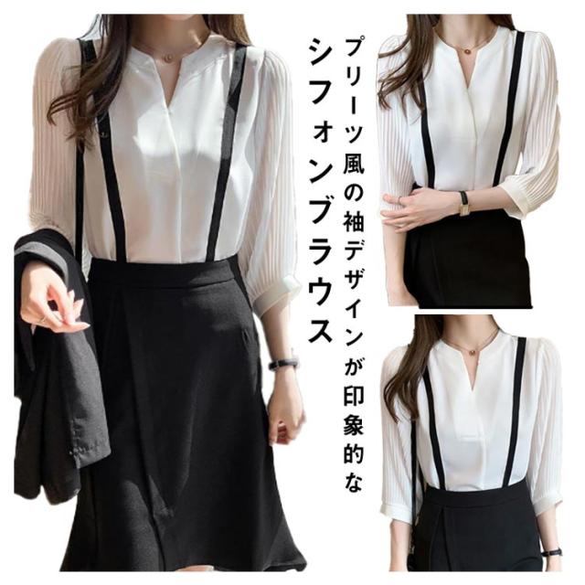 ブラウス シフォンブラウス レディース 七分袖 シフォン トップス 袖プリーツ キーネック ブラウス プルオーバー ライン入り スーツ インナー きれいめ オフィス カジュアル おしゃれ フェミニン フォーマル 通勤 入園式 入学式 卒園式 卒業式 七五三 服装 送料無料