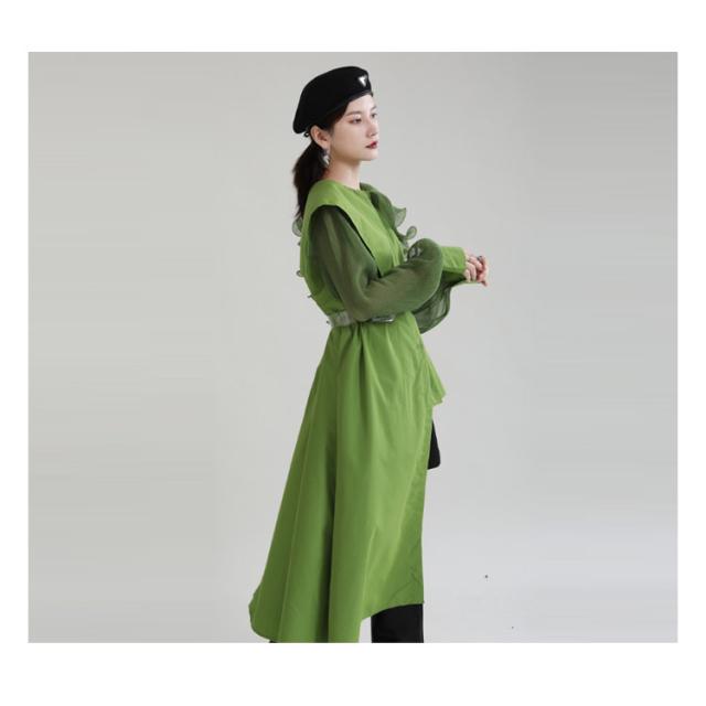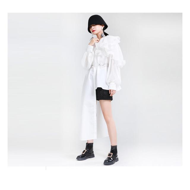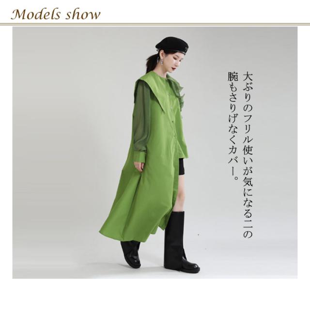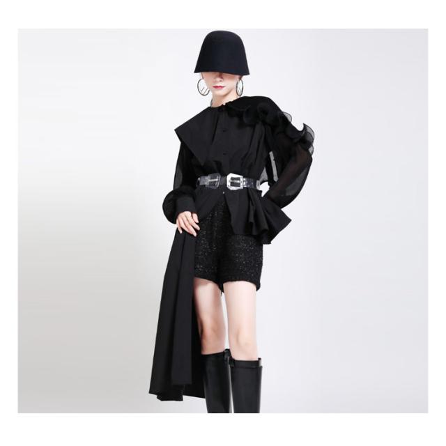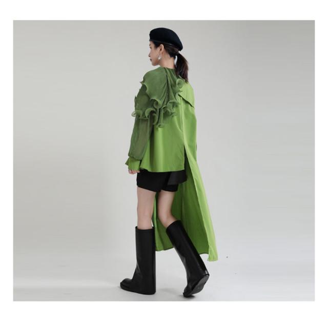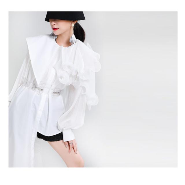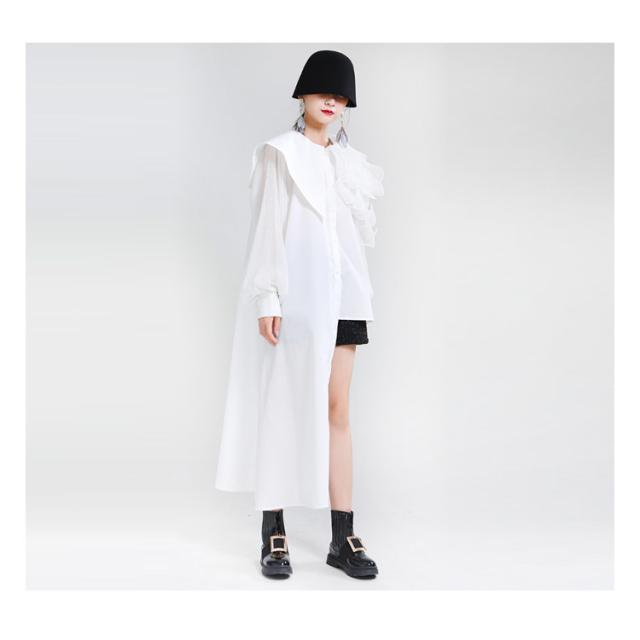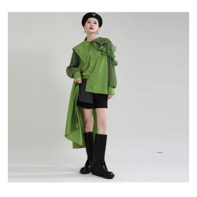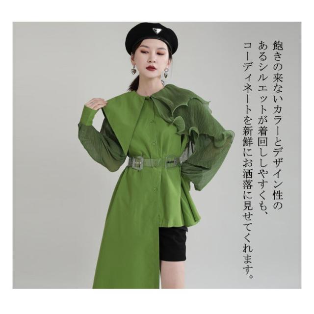 シャツ レディース ブラウス アシンメトリー ロングシャツ トップス 長袖 フリル襟 ビッグカラー ビッグ襟 変形 アシンメトリー アシメ ロングシャツ 異素材 切替 重ね着 レイヤード 大きいサイズ ゆったり 体型カバー 無地 きれいめ おしゃれ オフィス 春 夏 秋 送料無料