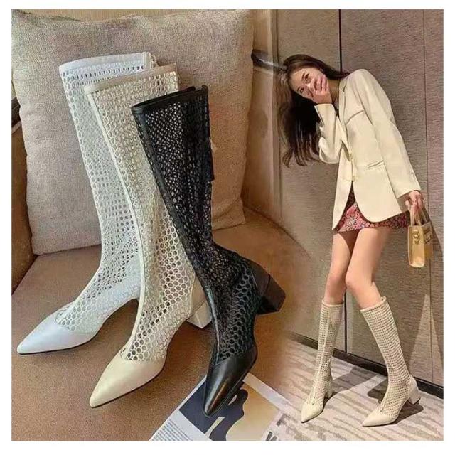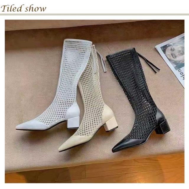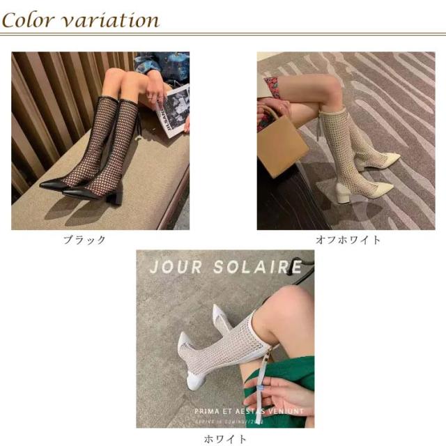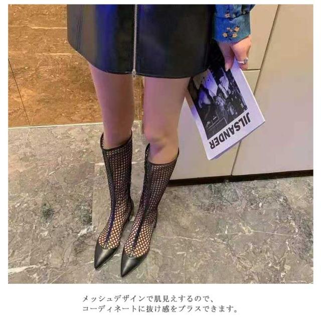 ロングブーツ メッシュブーツ レディース ブーツ メッシュ シースルー 透け感 太ヒール ローヒール ポインテッドトゥ 夏 サマーブーツ 美脚 歩きやすい 痛くない 靴 フェイクレザー 通気 涼しい 滑り止め 大きいサイズ 美脚 細見せ カジュアル きれいめ 春 夏