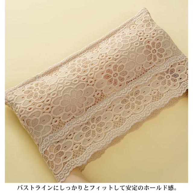 | ・カップ付きレースチューブブラ ・透け感のあるトップスや下着の締め付けが苦手な方に◎ ・バストラインにしっかりとフィットして安定のホールド感。 ・チューブトップの上部分には、ずり落ち防止の滑り止めを内蔵。 ・カップは取り出せるタイプなので、お手持ちのパッドと交換も出来ます。 ・左右一体型パッド入りなのでパッドが離れず位置が安定。 ・ストラップがないので、肩のこりやすいテレワークにもいかがでしょうか? ・暑い季節に一枚あると便利なチューブトップブラで、おうち時間を快適に、可愛らしいレースインナーで楽しく過ごしてくださいね。 | |