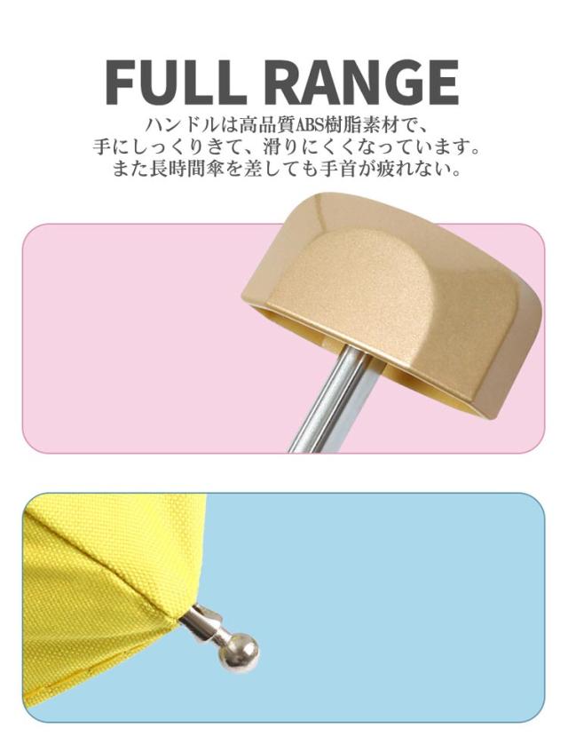 | 【重量182g】【長さ18cm】【UPF50+】【完全遮光】【傘下マイナス6-13℃】【収納袋付】【全11色】 折りたたみができるので、気軽に持ち歩け、日焼け対策アイテムとして最適です。また、完全遮光なので、強い日差しを遮り、猛暑でも涼しい快適に過ごすことができます。 夕立などの急な雨にも使え、一本あると便利です。降雨時のご使用においても防水性に優れているので雨の日、晴れの日兼用ご利用頂けます。毎日気軽に持ち歩けるよう、軽くてコンパクトなのも嬉しいポイントです。 シンプルなデザインであらゆるシーンに馴染む折りたたみ傘です。本体は僅か182gで、折りたたんでコンパクトサイズになるので、携帯するのに便利です。収納袋も付いていて、カバンに常備しておけるので、持ち運びやすいです。 晴雨兼用の折りたたみ日傘です。傘生地に特殊なコーティング加工を施しているため、より高い確率で優れた紫外線防止効果が得られ、紫外線を99.9%以上カットします。 親骨はアルミ合金製により、しなやかで折れにくい丈夫です。より強く、使いやすい傘になりました。 ハンドルは高品質ABS樹脂素材で、手にしっくりきて、滑りにくくなっています。また長時間傘を差しても手首が疲れない。 豊富なカラー展開で装いに合わせてチョイス。 | |