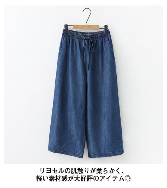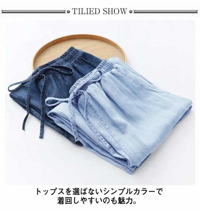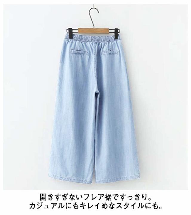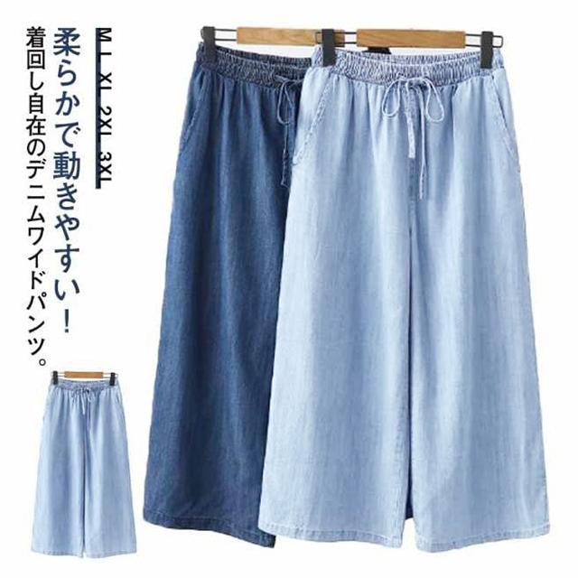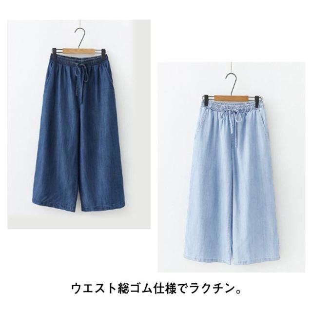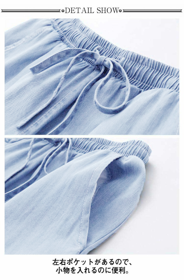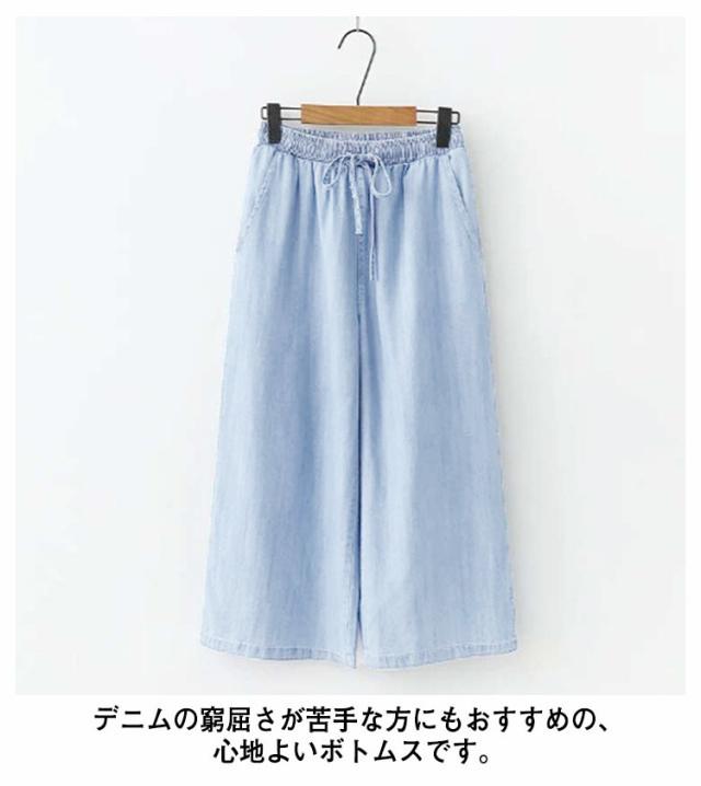 ワイドパンツ デニムパンツ ガウチョパンツ レディース 7分丈 涼しい ウェストゴム ハイウェスト ポケット付き イージーパンツ 薄手 ゆるパンツ カジュアル 夏 無地 全2色