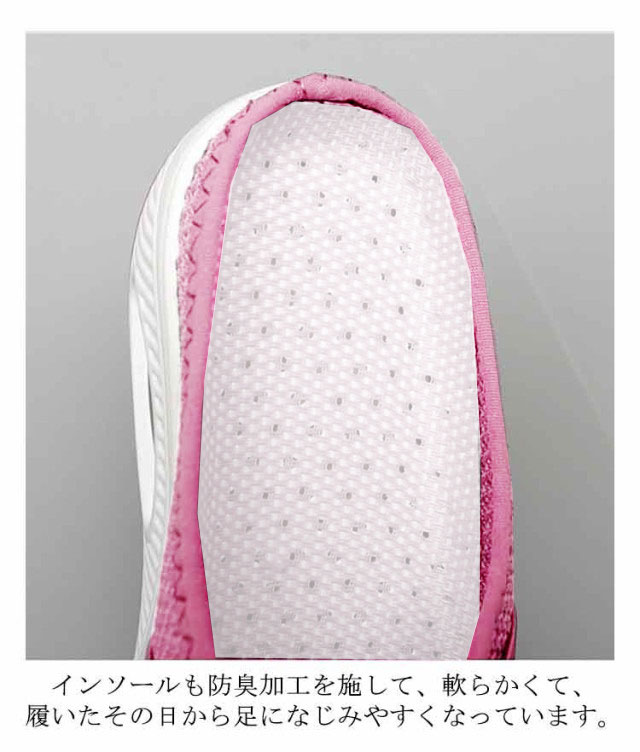 | 足への負担が少ない、軽い履き心地を楽しめるスニーカーです。 かかとなしで履き脱ぎに便利で、普段履きにも大活躍してくれます。 アッパーはメッシュ素材を採用し、通気性が良く、足が蒸れにくくなります。 インソールも防臭加工を施して、軟らかくて、履いたその日から足になじみやすくなっています。 凹凸のアウトソールは、滑りにくく安心して歩いていただけます。 お散歩や運転、ナースなどの長時間の立ち仕事、通勤、トラベル携帯などにもおすすめです | |
