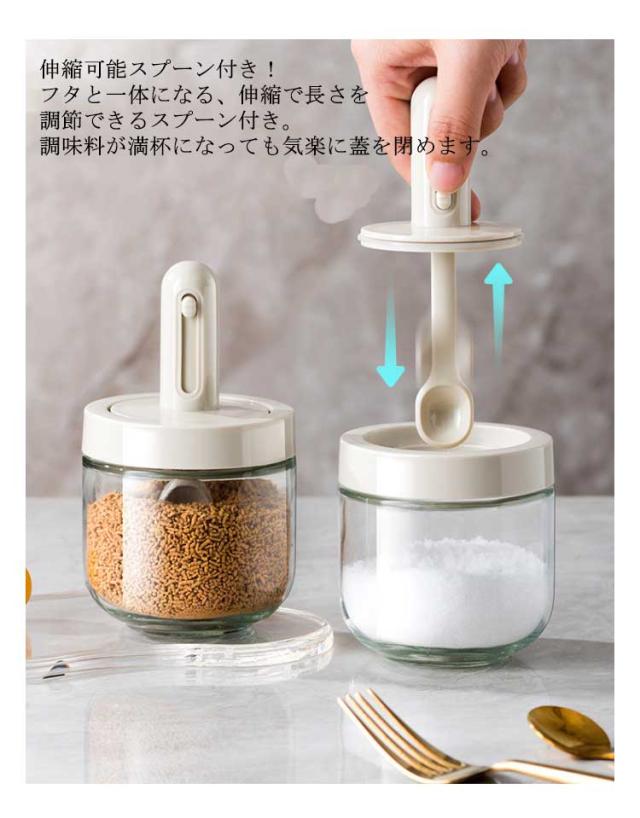 | 長さ調節可能のスプーン付き調味料入れ(2個セット)が登場。 伸縮可能スプーン付き!フタと一体になる、伸縮で長さを調節できるスプーン付き。調味料が満杯になっても気楽に蓋を閉めます。一番下まで届きますので調味料を使い切ることができます。 高いの密封性。蓋の間にシリコンリング付き、調味料入れの密封性を高め、空気中の水分の侵入を防止、調味料の乾燥性を維持します。 ぴったり2g!スプーン1杯に2g、料理中ゲージスプーンとして使える、どれくらいの調味料入れたのが把握できます、味が足りないや濃いすぎの可能性を減ります。 グラスの部分だけではなく、スプーンやフタなど、全パーツが食品衛生法基準による検査を通過、安心で安全な材質を使用します。 | |