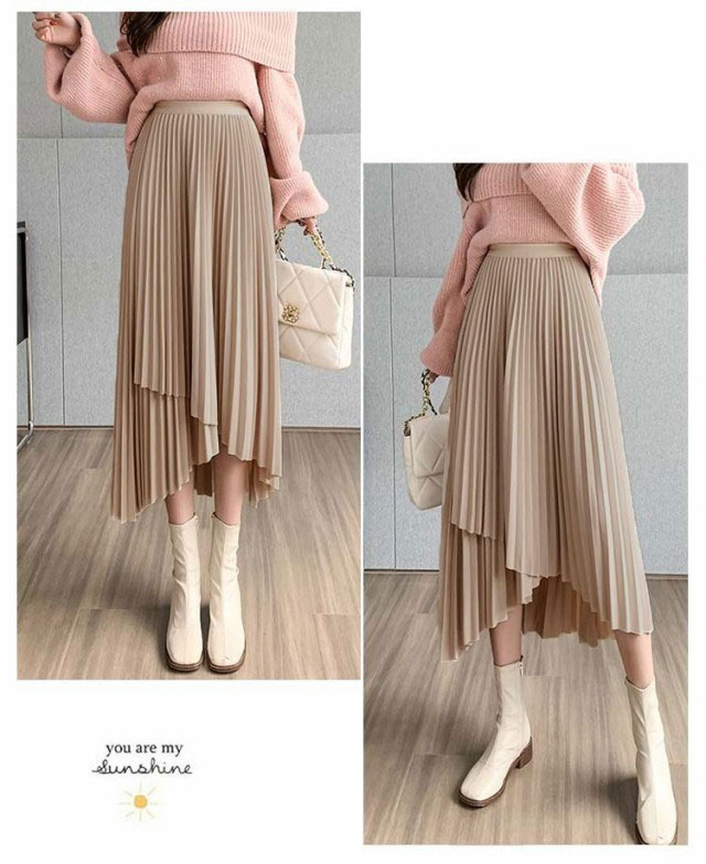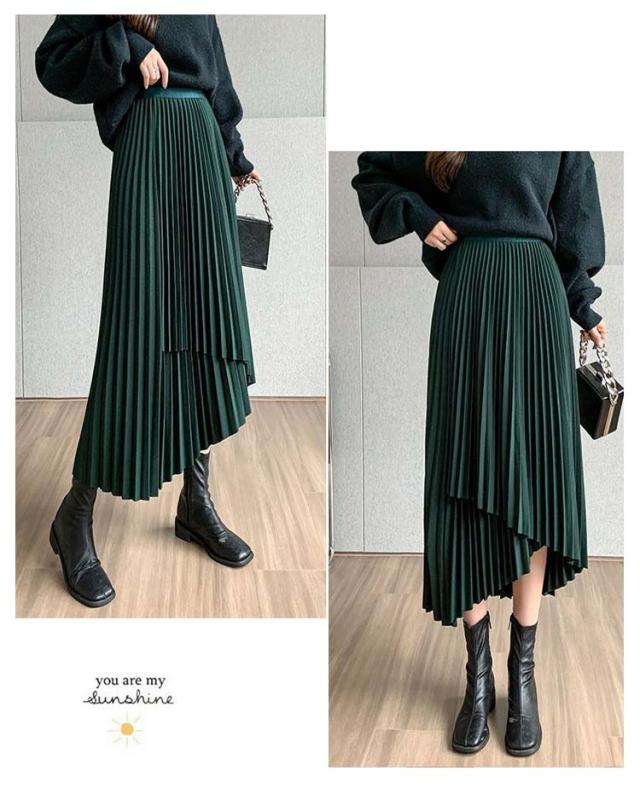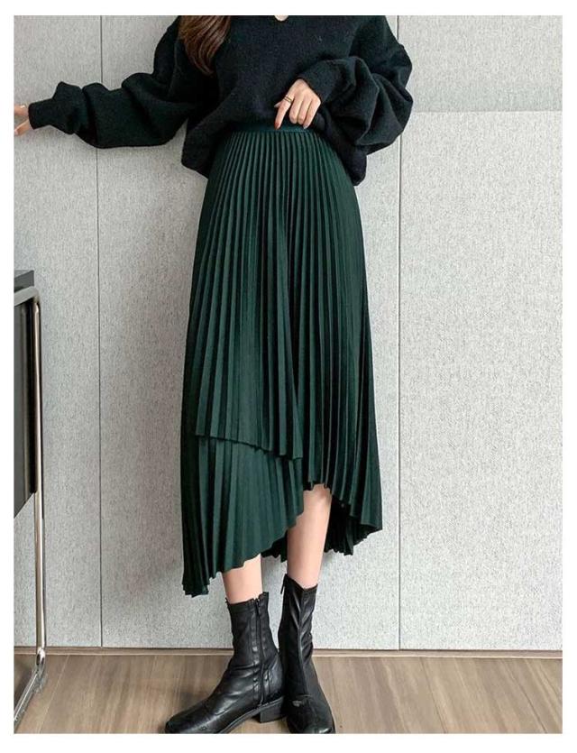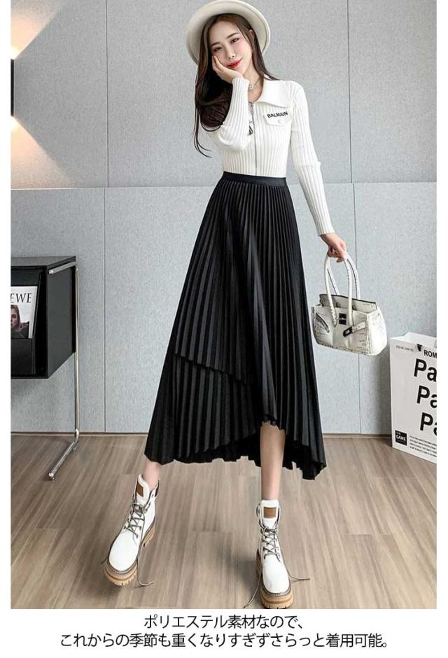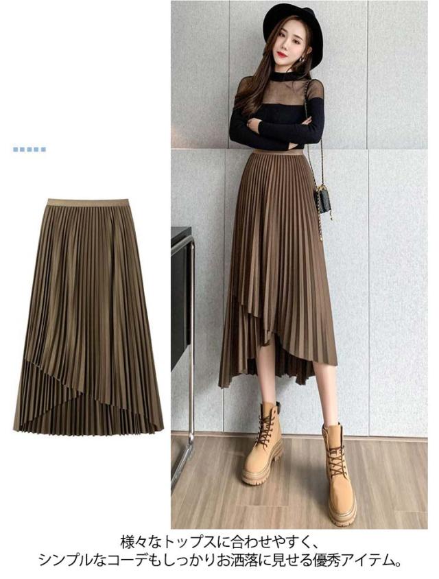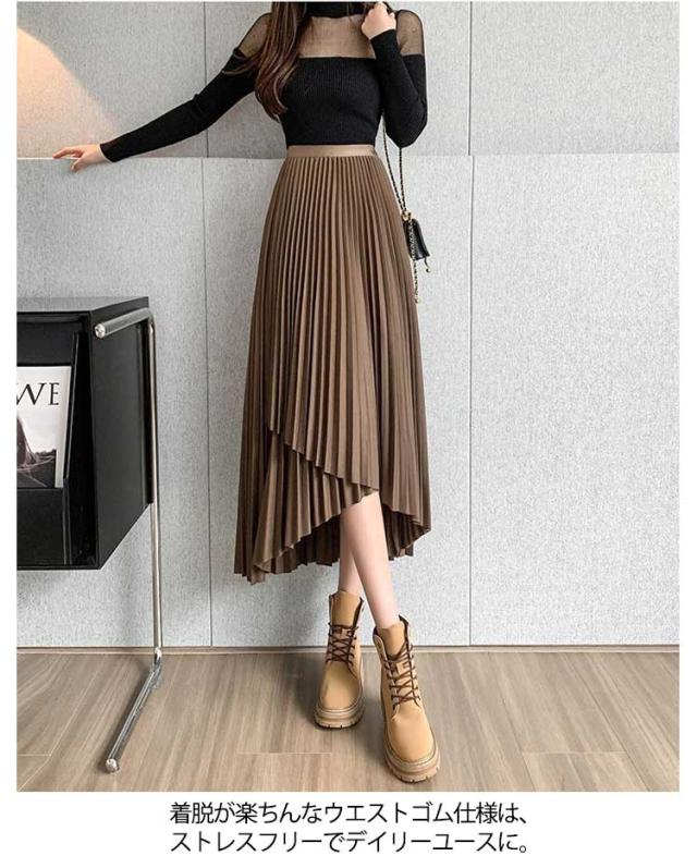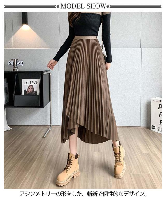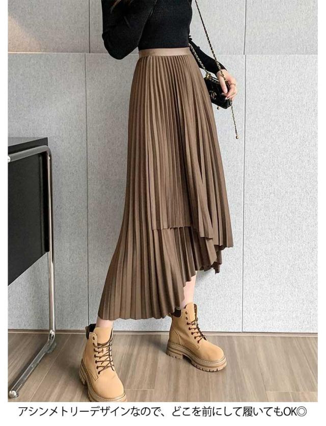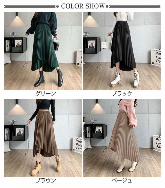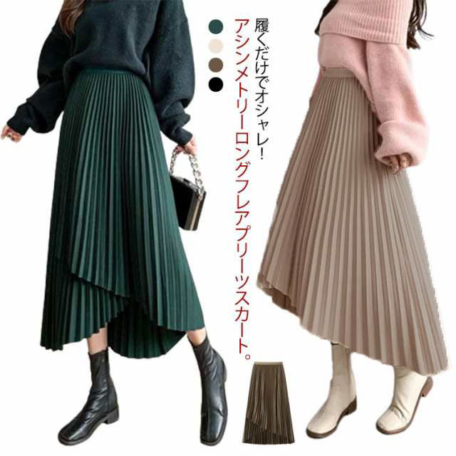 プリーツ スカート レディース ロングスカート ミモレ丈 アシンメトリー 前後差 フレアスカート 体型カバー フェミニン エレガント 高見え 大人 可愛い きれいめ 韓国風 グリーン ブラック 黒 ブラウン 20代 30代 40代 50代