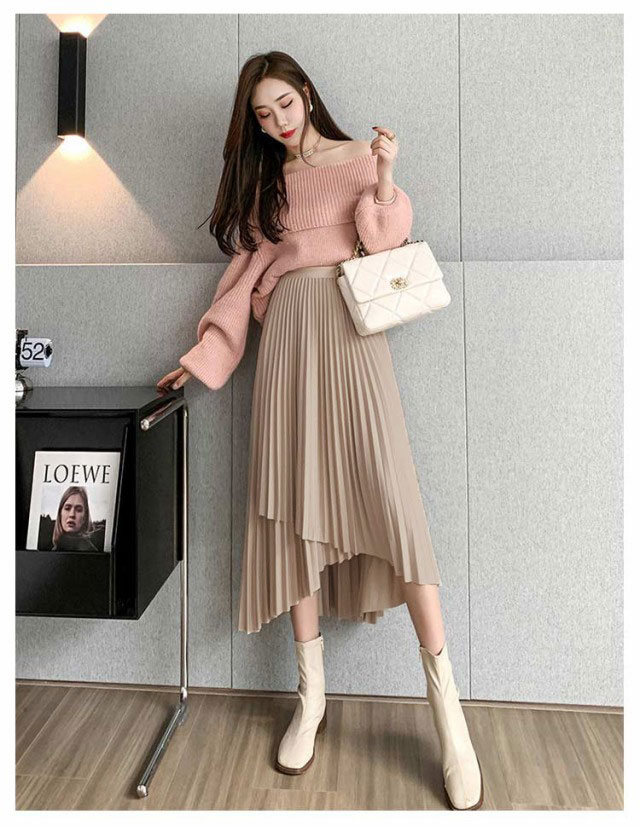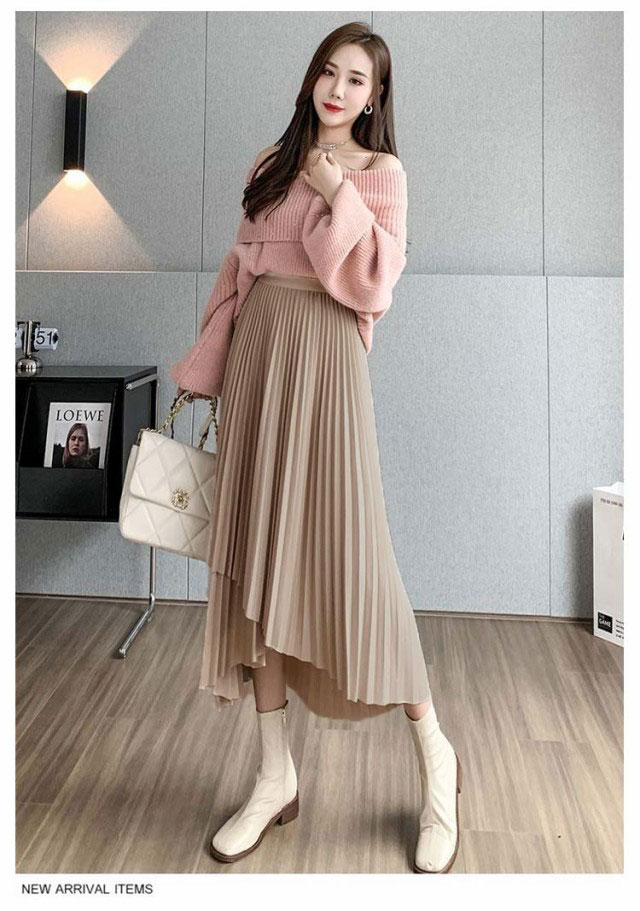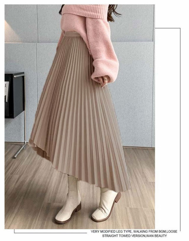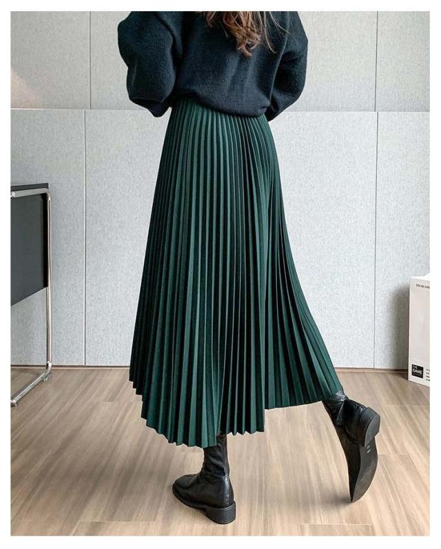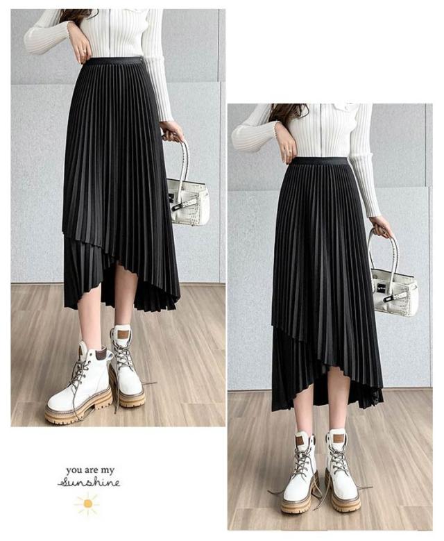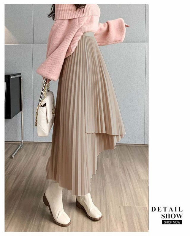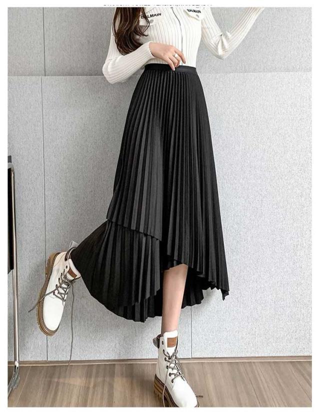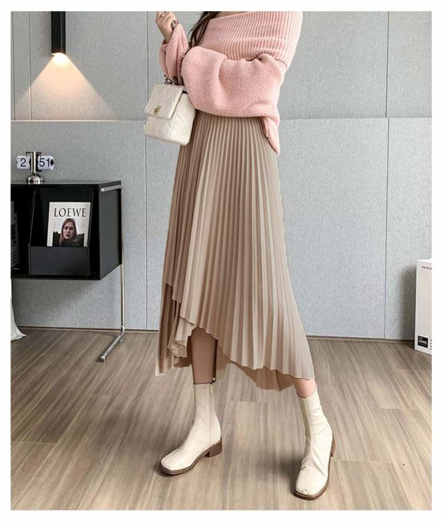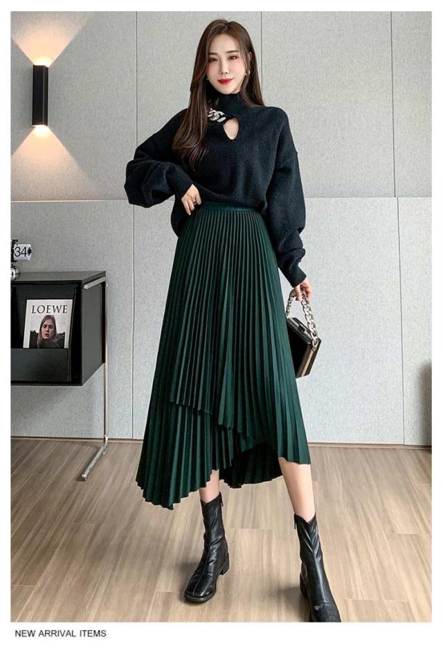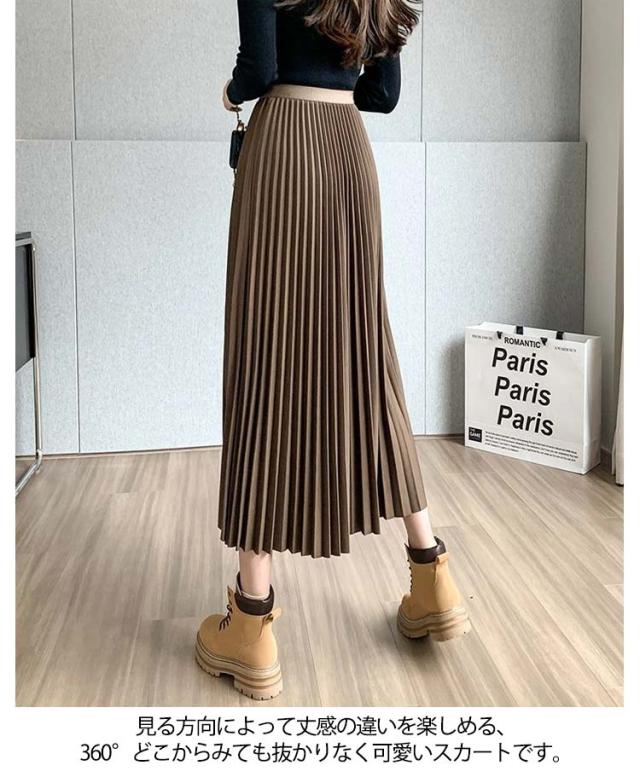 プリーツ スカート レディース ロングスカート ミモレ丈 アシンメトリー 前後差 フレアスカート 体型カバー フェミニン エレガント 高見え 大人 可愛い きれいめ 韓国風 グリーン ブラック 黒 ブラウン 20代 30代 40代 50代