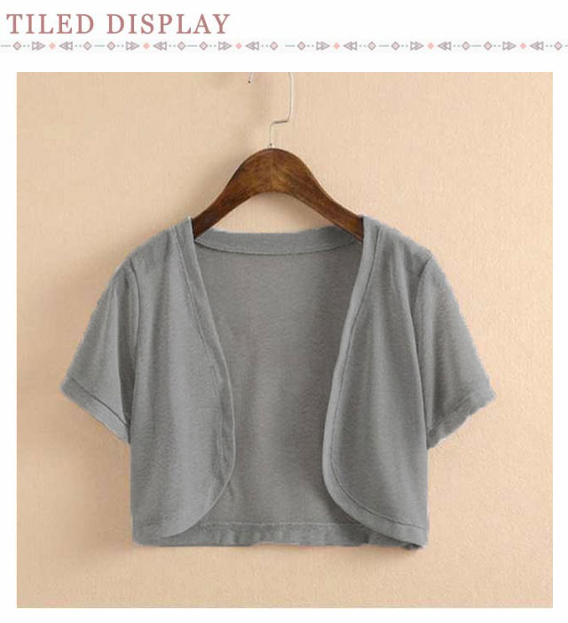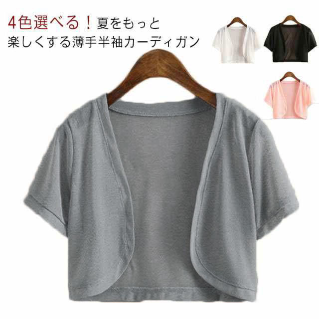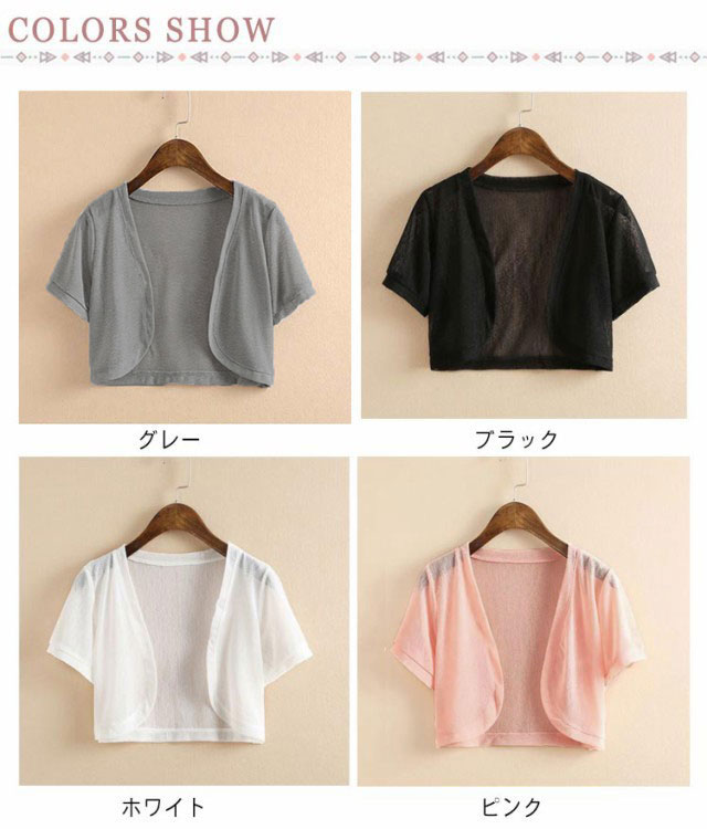 | 4色選べる!夏をもっと楽しくする薄手半袖カーディガン 冷房&UV対策、色んな場面に対応し羽織り、肩掛け、腰巻き様々なスタイルを楽しめてどれもステキ♪ デコルテが綺麗に見える定番のネック。インナーとレイヤードを楽しめる。 ショート丈なのでデニム、ショートパンツ、ワンピース、スカートどんなボトムでも相性良くすっきりとしたバランスで着こなせる | |