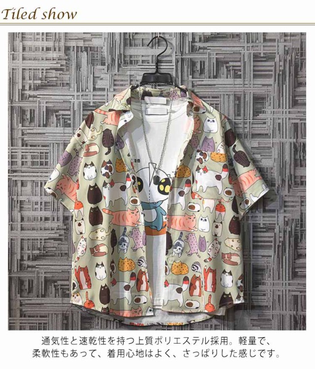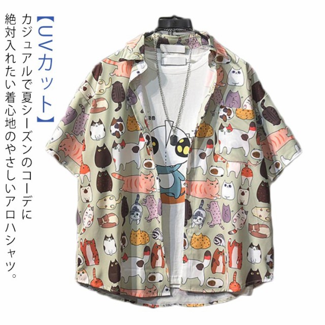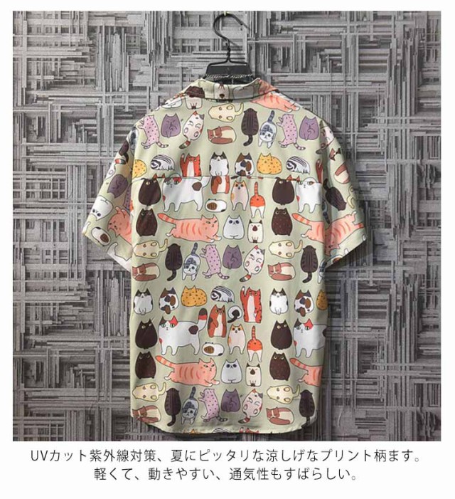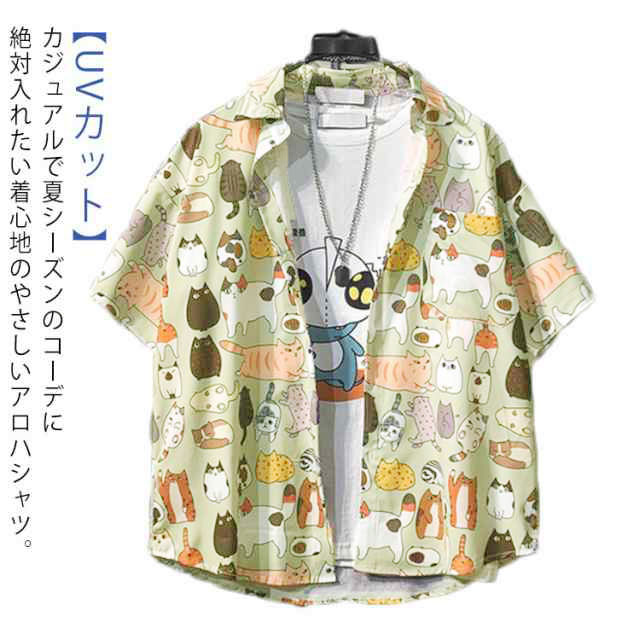アロハシャツ 猫 メンズ 大きいサイズ 薄手 ゆったり カジュアル 和柄 半袖 5分袖 ねこ ネコ ハワイ おしゃれ かわいい ワイアンシャツ サマーシャツ リゾート 男女兼用