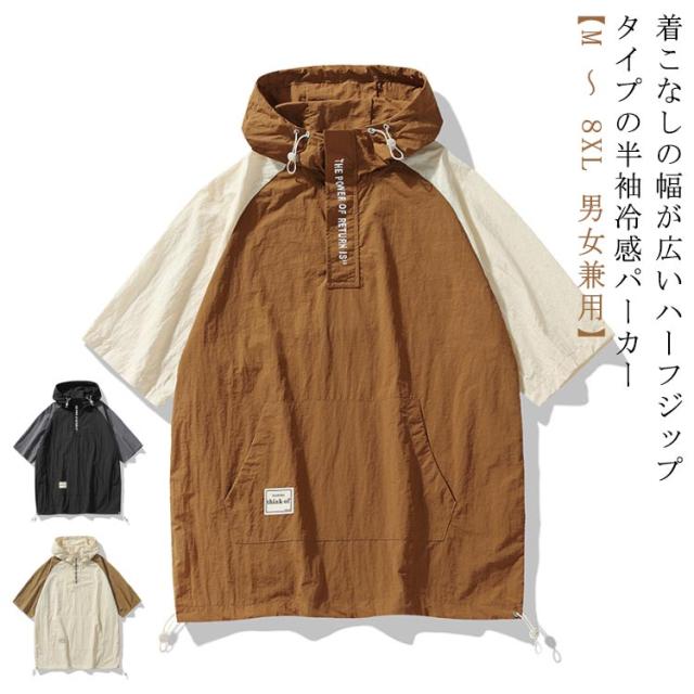 | 【 M 〜 8XL 男女兼用】 【着こなしの幅が広いハーフジップタイプの半袖冷感パーカー】 軽量で耐久性のあるナイロン素材を採用し、薄手で通気性に優れており、夏のコーデにぴったりです。 フードと裾部分にドローコードが付いているため、シルエットの調節も可能です。 ゆったりとしたシルエットでトレンド感を演出できます。 型崩れしにくく、デイリーな着回しに重宝します。 | |