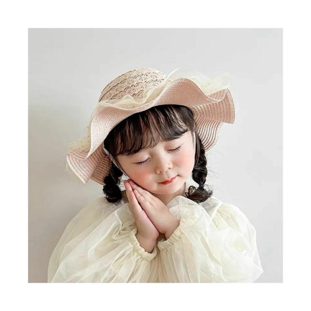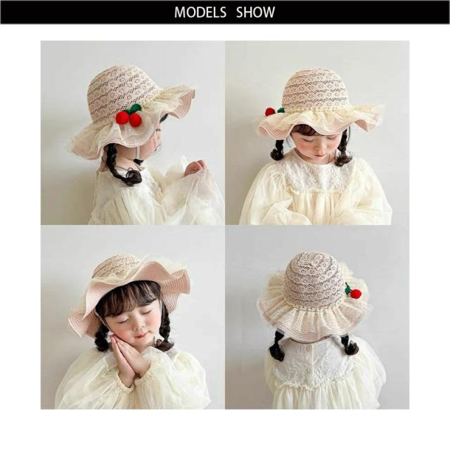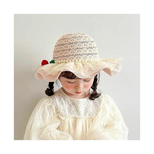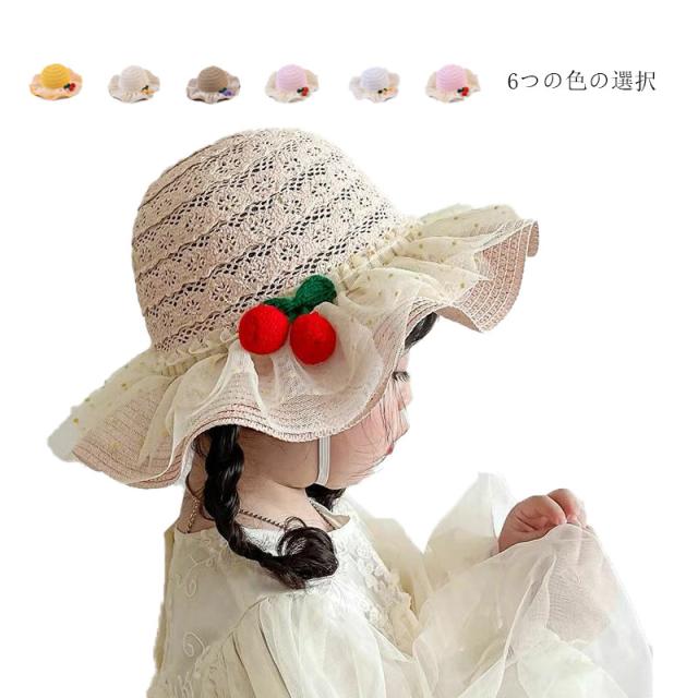 麦わら帽子 キッズ 日焼け防止帽子 UVカット 紫外線対策用 子供用 麦わら 帽子 桜桃帽子 おしゃれ帽子 子ども用 女の子 日焼け止め ビーチハット つば広 フリルハット アウトドア 通気性 可愛い 夏 送料無料 かわいい おしゃれ