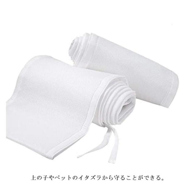 | 通気性抜群なメッシュ素材のベビーベッドガード。 通気性の良いメッシュを使用するので、ベビーベッドの中の空気を循環させて悪い空気がこもりません。 マジックテープで長さ調節ができるから、様々なベッドの形に対応しています。 紐でベッドに固定できるので、外れにくくより安全で安心です。 洗濯機で水洗いできるからお手入れ楽々。 ベッドの柵に頭や手足をぶつけないように保護できる。 柵の隙間を埋めて、手足を挟まないようにできる。 エアコンの風が直接当たらないように防ぐことができる。 上の子やペットのイタズラから守ることができる。 | |