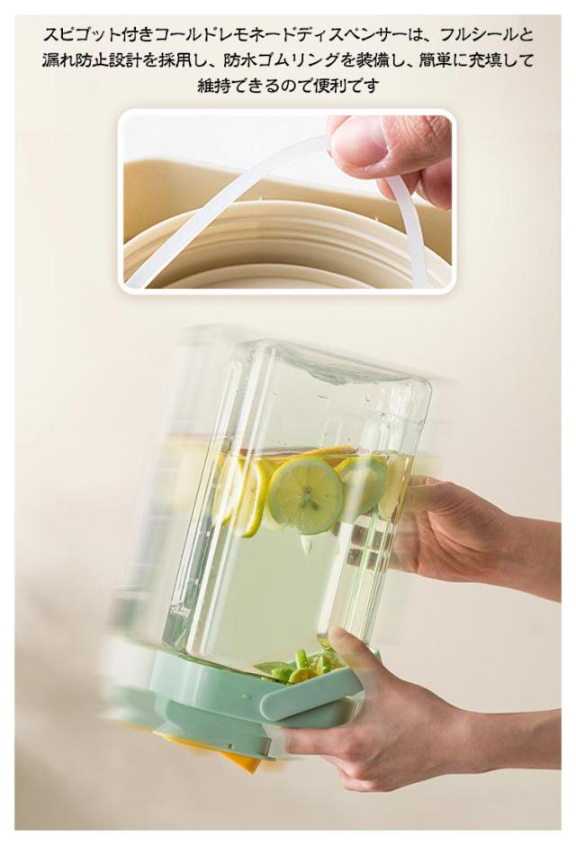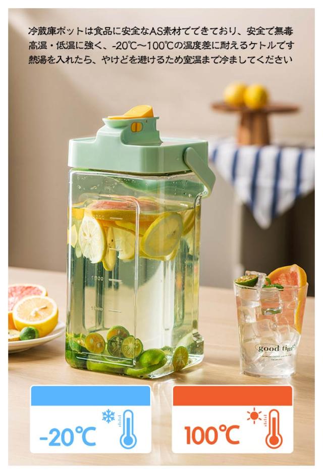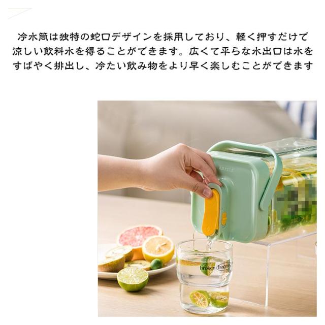 | 蛇口付き冷蔵庫ポット 2個セット 【高品質材料&耐熱・耐冷】冷蔵庫ポットは食品に安全なAS素材でできており、安全で無毒、高温・低温に強く、-20℃〜100℃の温度差に耐えるケトルです。熱湯を入れたら、やけどを避けるため室温まで冷ましてください。 【大きな出水量】冷水筒は独特の蛇口デザインを採用しており、軽く押すだけで涼しい飲料水を得ることができます。広くて平らな水出口は水をすばやく排出し、冷たい飲み物をより早く楽しむことができます。 【漏れ防止設計】スピゴット付きコールドレモネードディスペンサーは、フルシールと漏れ防止設計を採用し、防水ゴムリングを装備し、簡単に充填して維持できるので便利です。 【3.5L大容量】飲料ディスペンサーは、約3.5リットルの大容量で設計されており、1日2人の取水量に対応でき、広い開口部の蓋が付いているため、簡単にお手入れできます。 【飲料水ディスペンサー】レモネードバケットは冷蔵庫に収まるコンパクトなサイズで、暑い夏にワイン、アイスティー、レモネード、フルーツジュース、ミルク、水を冷蔵でき、さわやかで涼しい味をもたらします。 | |