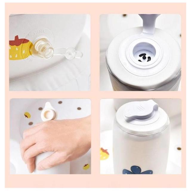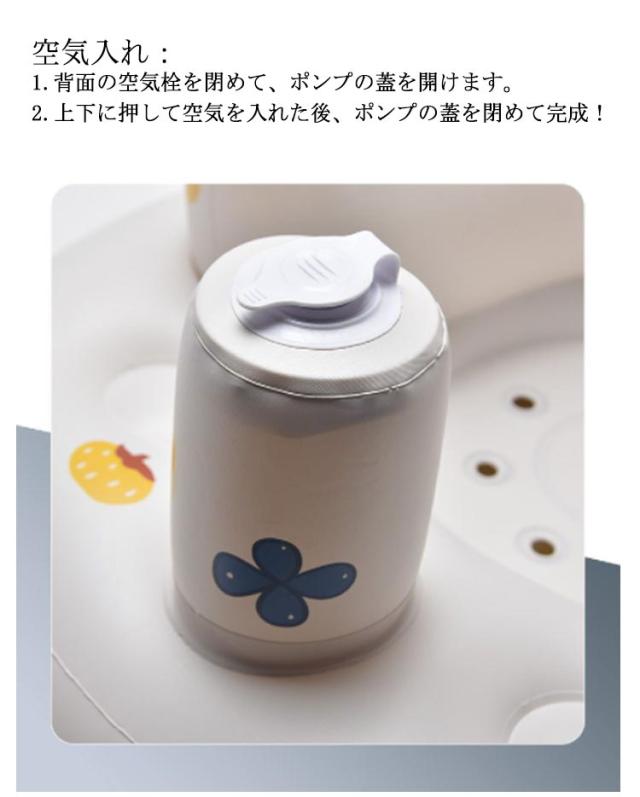 | お風呂やお食事、外出先などどこでも使える便利なベビーチェア やさしい座り心地のやわらかチェア。お風呂ではバスチェアとして、リビングではイスとして使えます。 前倒れしにくい低座面・低重心構造。安定した座り心地で、やわらかいクッションが赤ちゃんをやさしく支えます。 エアーポンプを内蔵しているので、旅行や帰省の際に持ち運ぶこともできます。 空気入れ: 1.背面の空気栓を閉めて、ポンプの蓋を開けます。 2.上下に押して空気を入れた後、ポンプの蓋を閉めて完成! | |