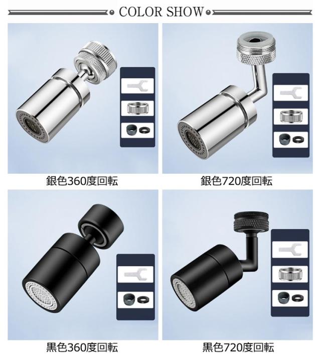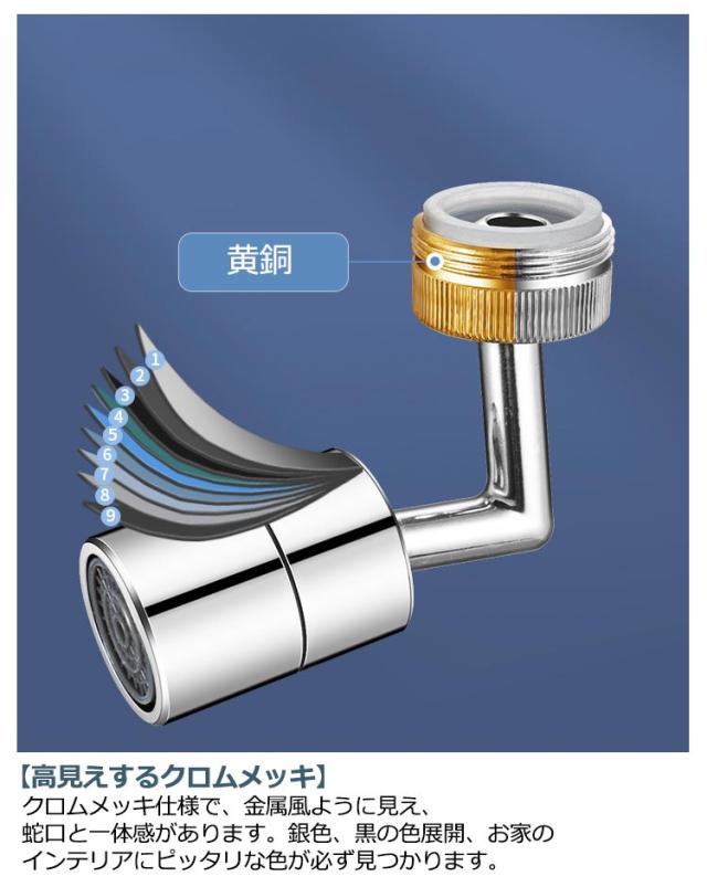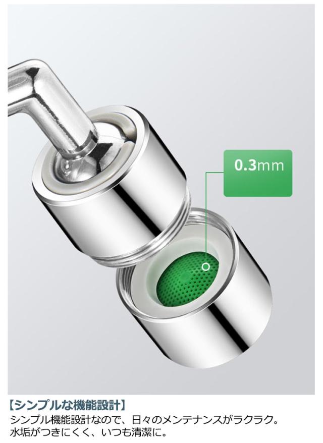 | 工事不要・360°/720°角度調整・2種類の水流モード・内ねじ・外ねじ兼用 節水型キッチンシャワーヘッド♪ 【水道代の節約に】空気注入方式の節水構造で、最大約30%の節水効果があります。 【かゆいところまで届く】ヘッドの向きを360°/720°角度調整できるから、ミンクの隅々までシャワーが届くの従来のヘッドと比べて、手間や時間を省くことができるのが特徴。 【高見えするクロムメッキ】クロムメッキ仕様で、金属風ように見え、蛇口と一体感があります。銀色、黒の色展開、お家のインテリアにピッタリな色が必ず見つかります。 【ワンタッチ水流切り替え】ヘッドを回して、バブル水流・シャワー水流を簡単に切り替え。 【シンプルな機能設計】シンプル機能設計なので、日々のメンテナンスがラクラク。水垢がつきにくく、いつも清潔に。 【取付簡単】元のシャワーヘッドを外して、本製品を取り付けるだけの簡単設置。 【様々な蛇口で使用可能】アタッチメント付属で、外ねじ22mm・内ねじ24mmも兼用できるから、ほとんどの蛇口に適応♪ | |