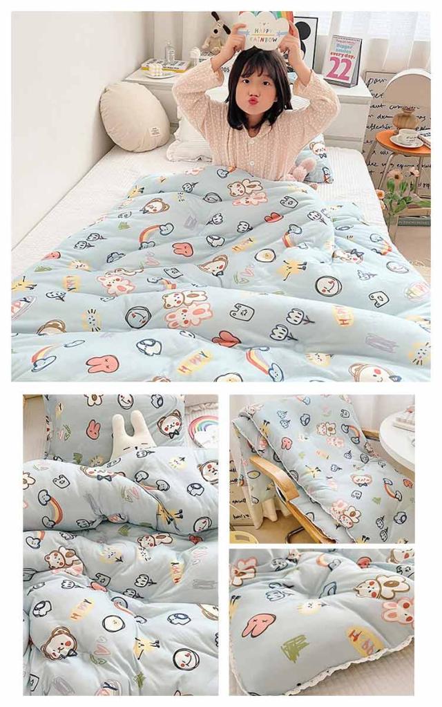 | 丸洗いOK♪子供用肌掛け布団。 肌触り部分は優しい綿コットン生地、カバー不要でお手入れ簡単。 夏の寝冷え対策タイプと春秋にちょうどいい2種類展開。 気軽に洗えて、乾きやすいから、お手入れも楽々。 万が一汚れても大丈夫です!ご自宅で洗えるからいつも清潔! 軽くてふかふか柔らかい、お肌に優しい。 | |