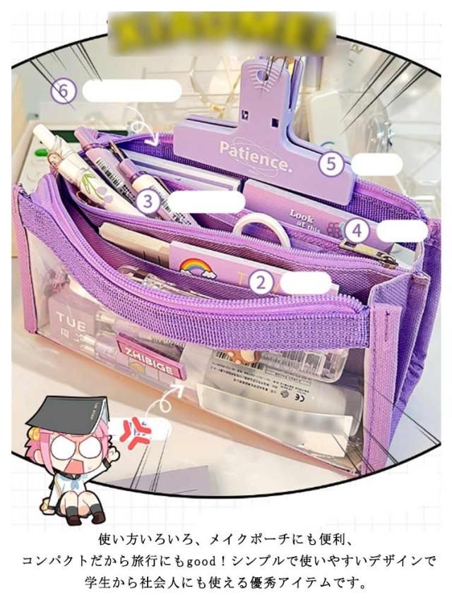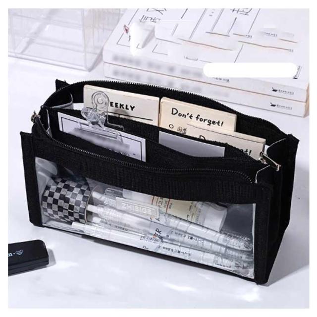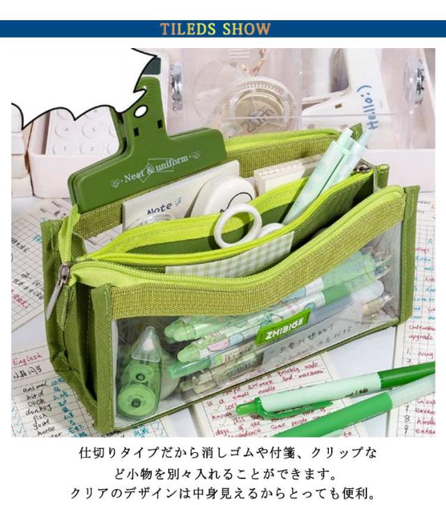| 小物の収納もスッキリ!大容量クリアペンケース 仕切りタイプだから消しゴムや付箋、クリップなど小物を別々入れることができます。 クリアのデザインは中身見えるからとっても便利。 丈夫で厚手な生地を使用、長くご愛用頂けます。pvc素材だから撥水機能もあります。 メインファスナーが大きく開くので、必要なものをスマートに取り出すことができ、ファスナーには引き手がついているので開閉しやすくなっています。 使い方いろいろ、メイクポーチにも便利、コンパクトだから旅行にもgood! シンプルで使いやすいデザインで学生から社会人にも使える優秀アイテムです。 | |