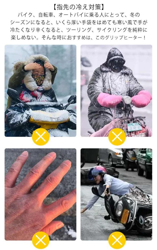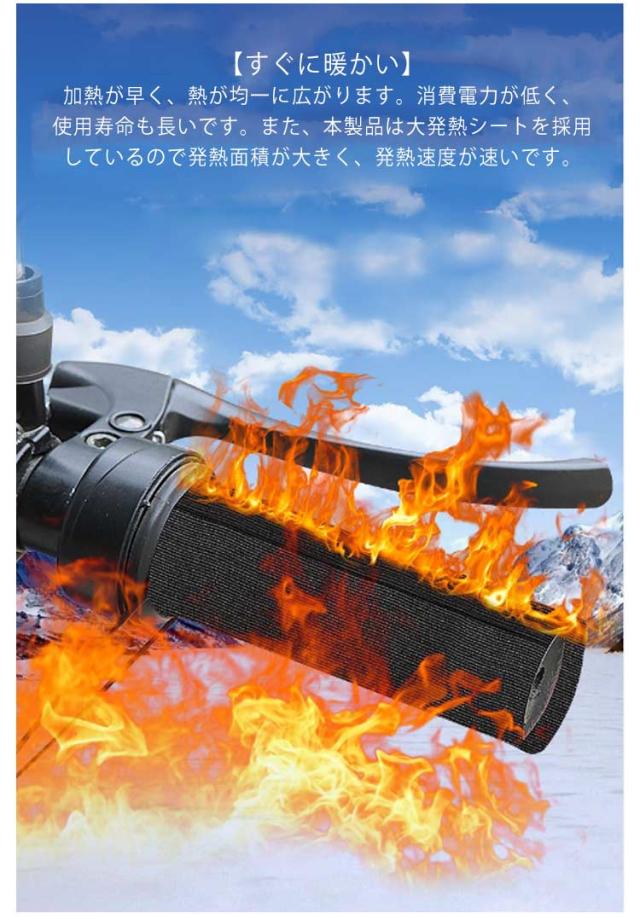 | 【指先の冷え対策】バイク、自転車、オートバイに乗る人にとって、冬のシーズンになると、いくら厚い手袋をはめても寒い風で手が冷たくなり辛くなると、ツーリング、サイクリングを純粋に楽しめない。そんな時におすすめは、このグリップヒーター! 【すぐに暖かい】加熱が早く、熱が均一に広がります。消費電力が低く、使用寿命も長いです。また、本製品は大発熱シートを採用しているので発熱面積が大きく、発熱速度が速いです。 【三段階の温度調整】3段階の温度調整ができるので、気温等に合わせてお好みの暖かさに調整できます。スイッチ付きで手元でのオンオフ切り替え可能! 【防水 水洗い可能】スイッチやハンドルカバーが水に濡れても正常に動作します。寒い冬場のバイカーの悩みの一つ、手先の冷えを解消してくれるUSBバイクハンドル用防水ホットグリップです。 【USBポート 簡単便利】USBポートに直接挿入して使用することができ、簡単に使用できます。マジックテープを巻きつけて貼れば装着できます。通勤通学やフードデリバリー、サイクリングなど幅広い用途で活躍します。 | |