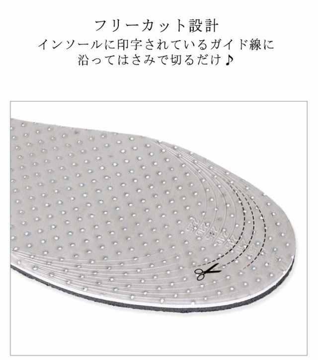 | 脚長インソール サイズに合わせて自由にカット♪ 柔らかくて弾カのあるフィット感。 フリーカット設計 インソールに印字されているガイド線に沿ってはさみで切るだけ♪ | |
