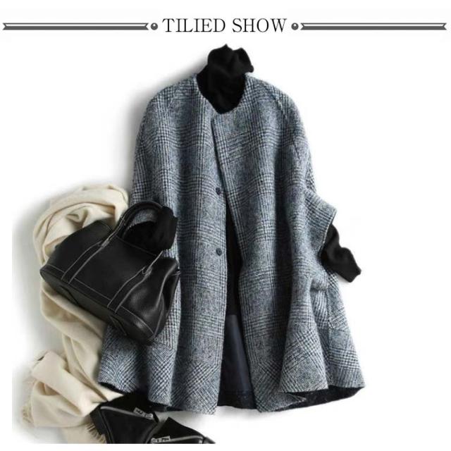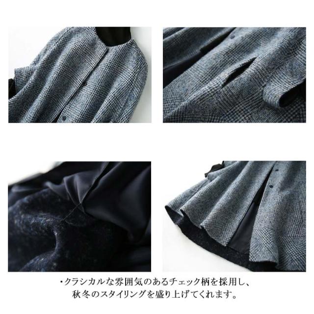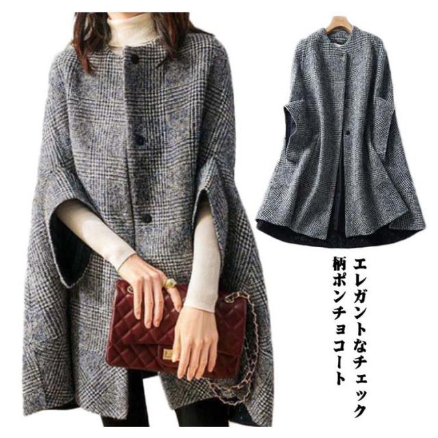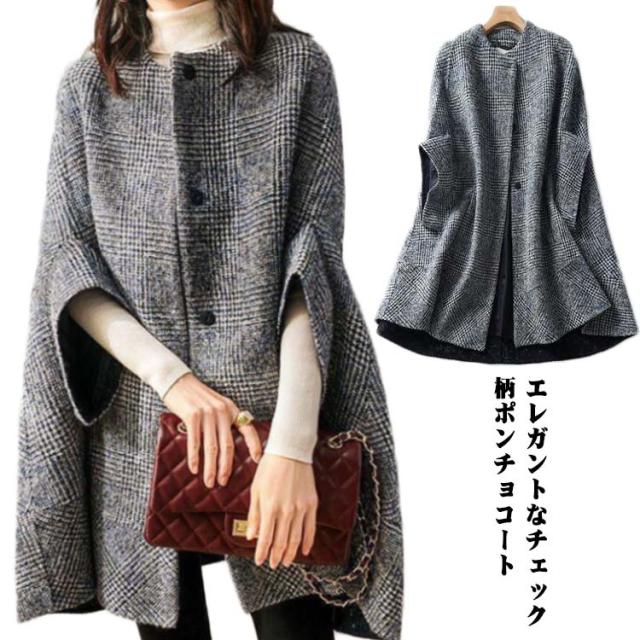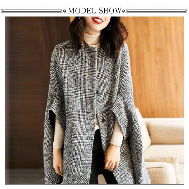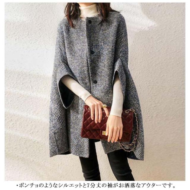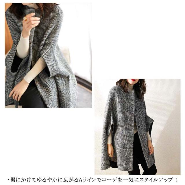 ジャケット ポンチョコート フレア レディース ケープコート ウールライク ケープコート 袖あり チェック柄 マント ロングコート アウター 7分袖 ノーカラー 前開き ボタン 春 秋